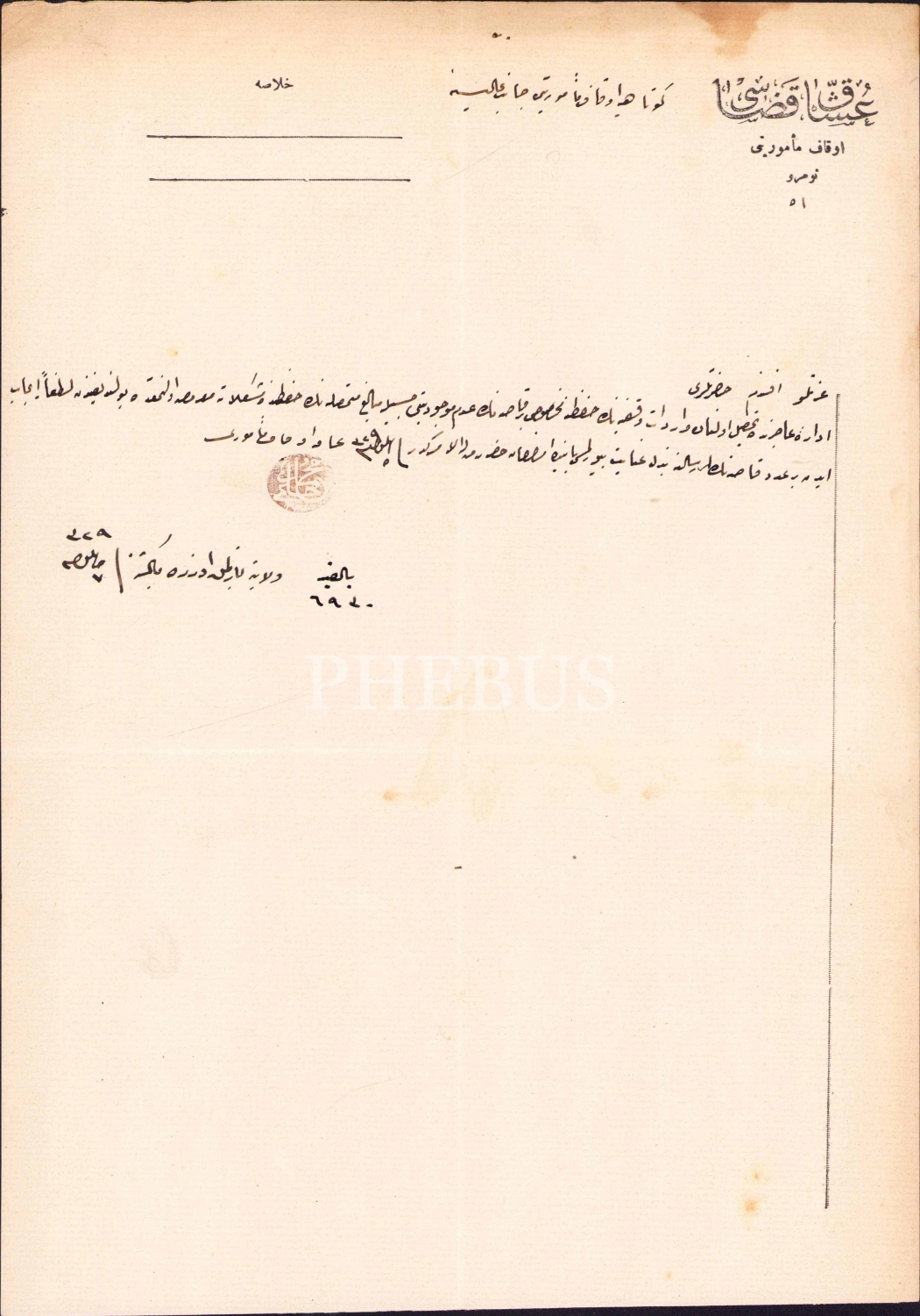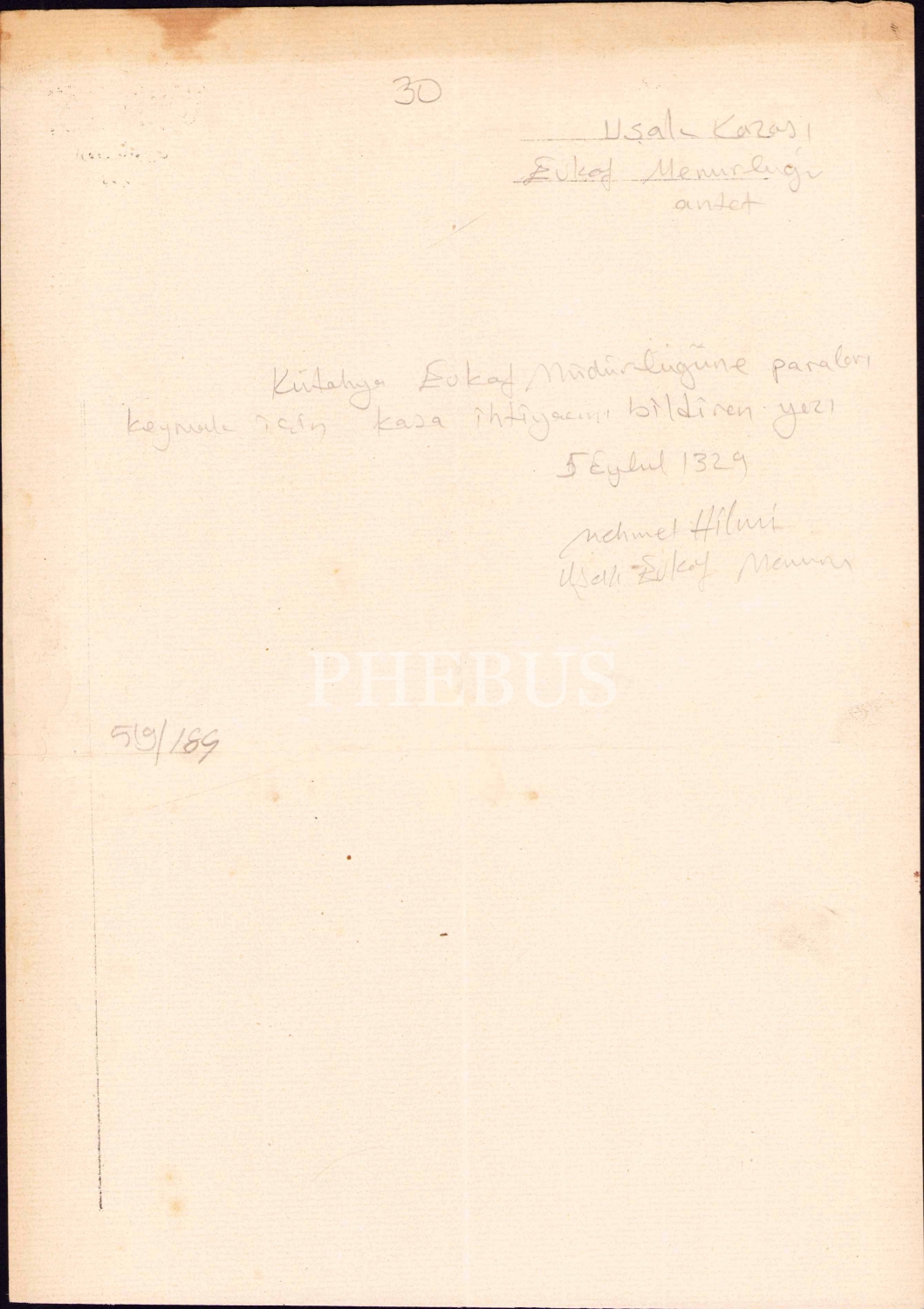 Uşak Kazası Evkaf Müdürlüğü antetli Mehmed Hilmi mühürlü, 1329 tarihli Osmanlıca evrak, 22x32 cm