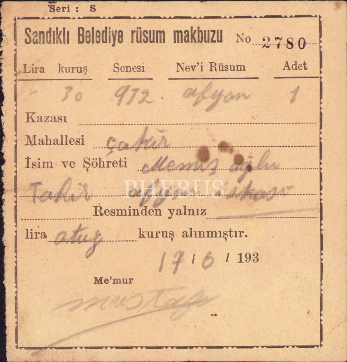 Sandıklı Belediye rüsum makbuzu, 1932, 11x10 cm