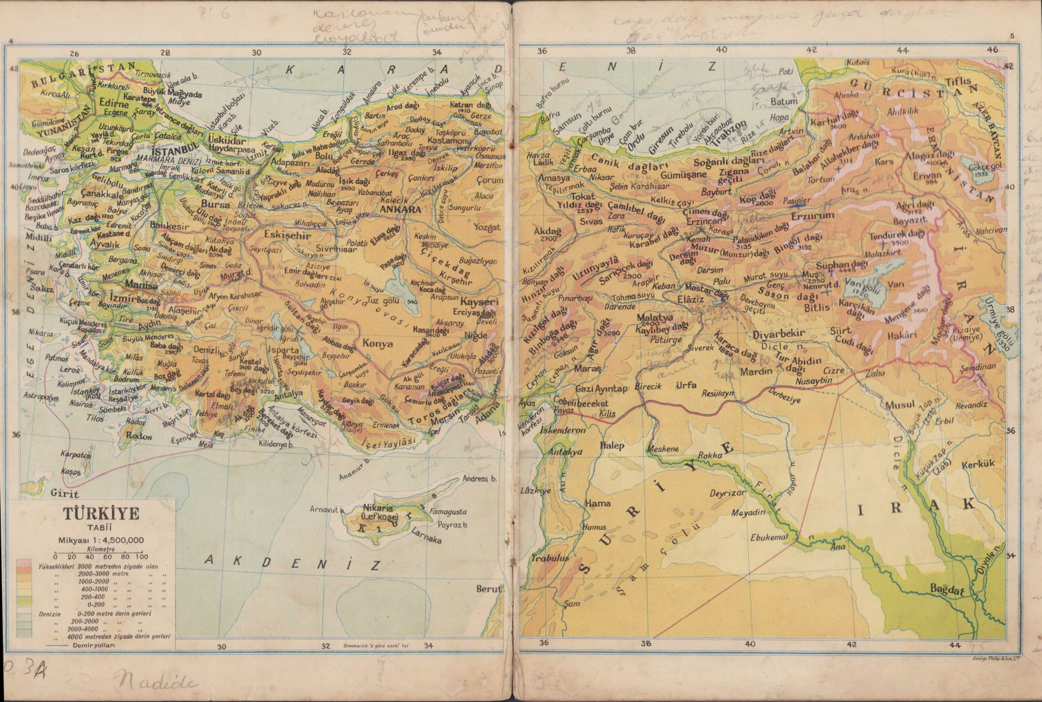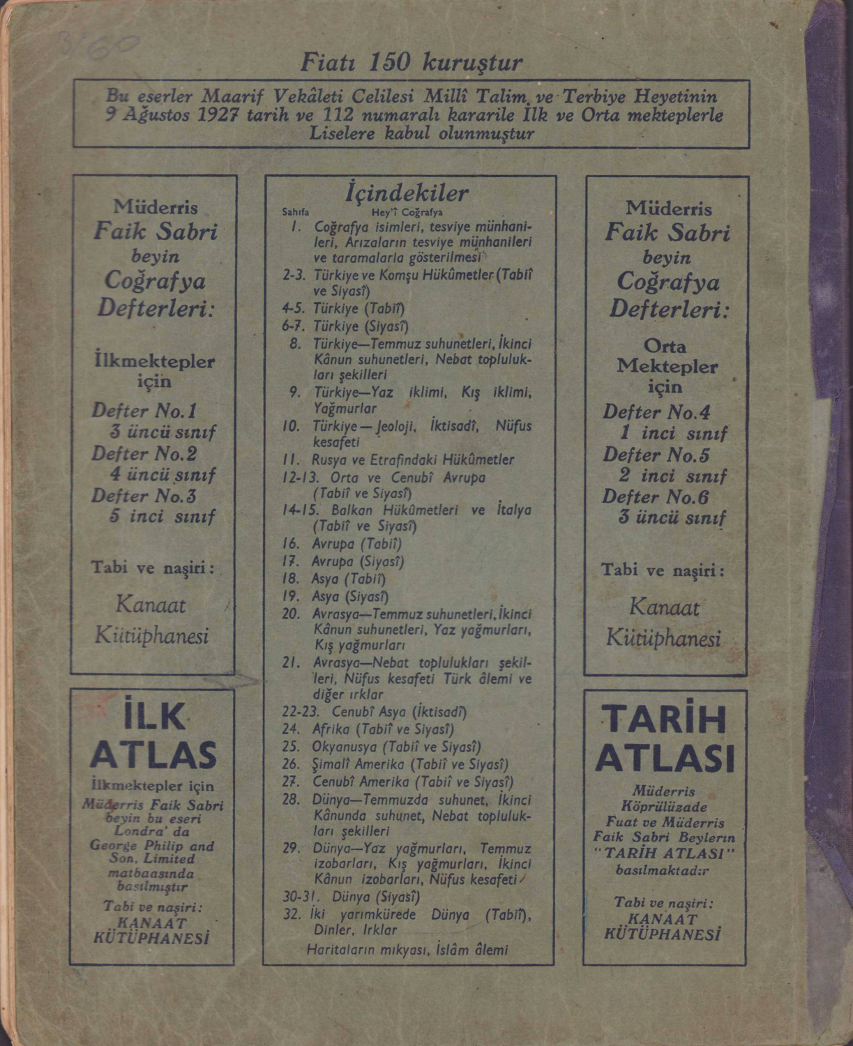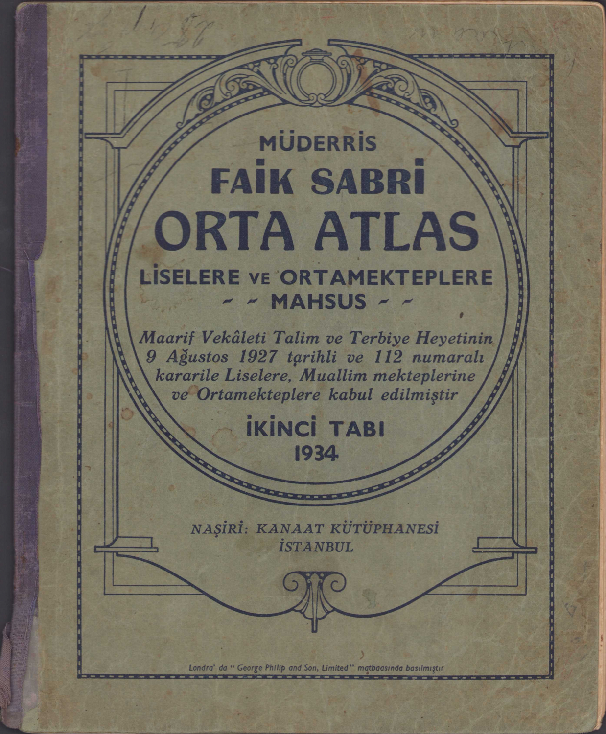 Orta Atlas, Liselere ve Ortamekteplere Mahsus, Müderris Faik Sabri, ikinci baskı, 1934 tarihli, Kanaat Kütüphanesi baskısı, İstanbul, 24 sayfa, 23x29cm