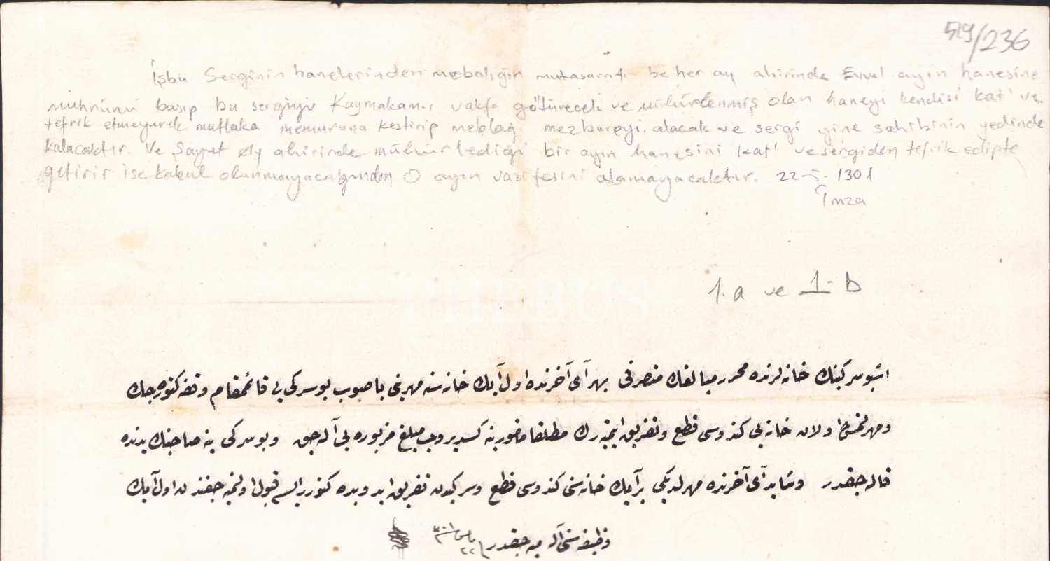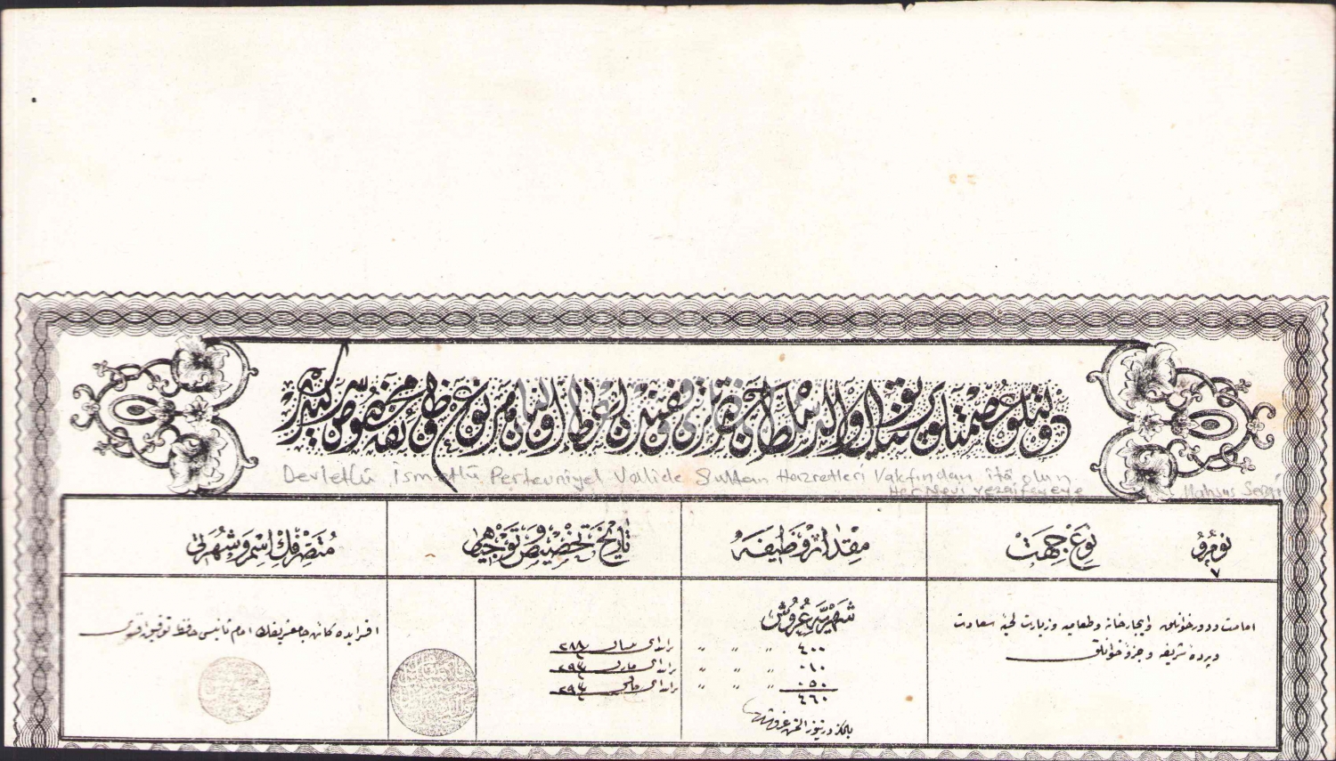Pertevniyal Valide Sultan Hazretlerini vakfından ita olunan her çeşit vazifeye mahsus sergi ile alakalı 1301 tarihli Osmanlıca evrak, 28x16 cm