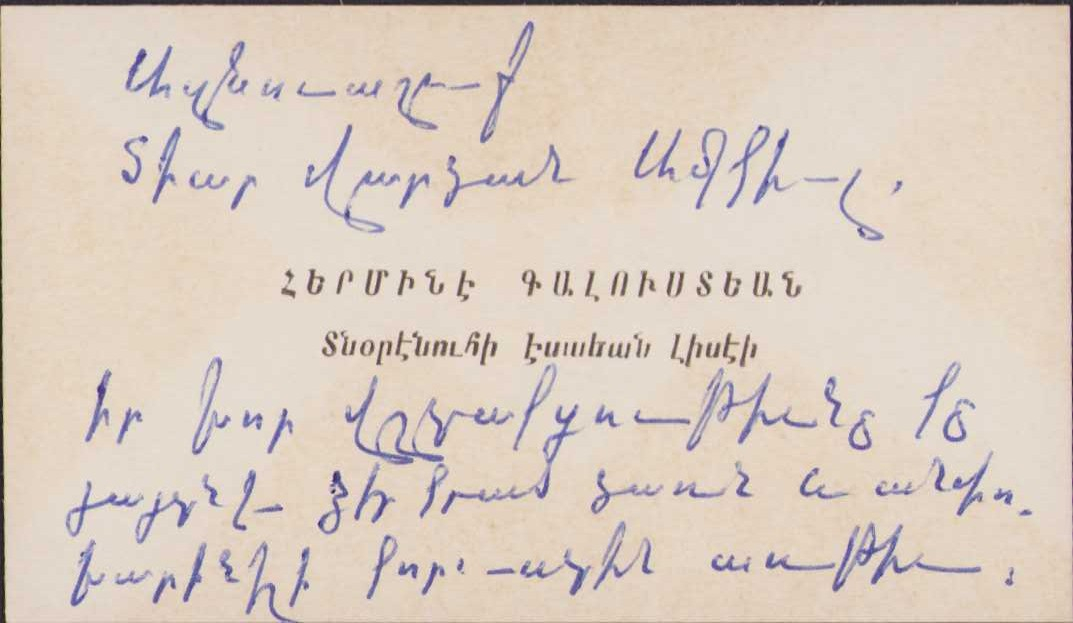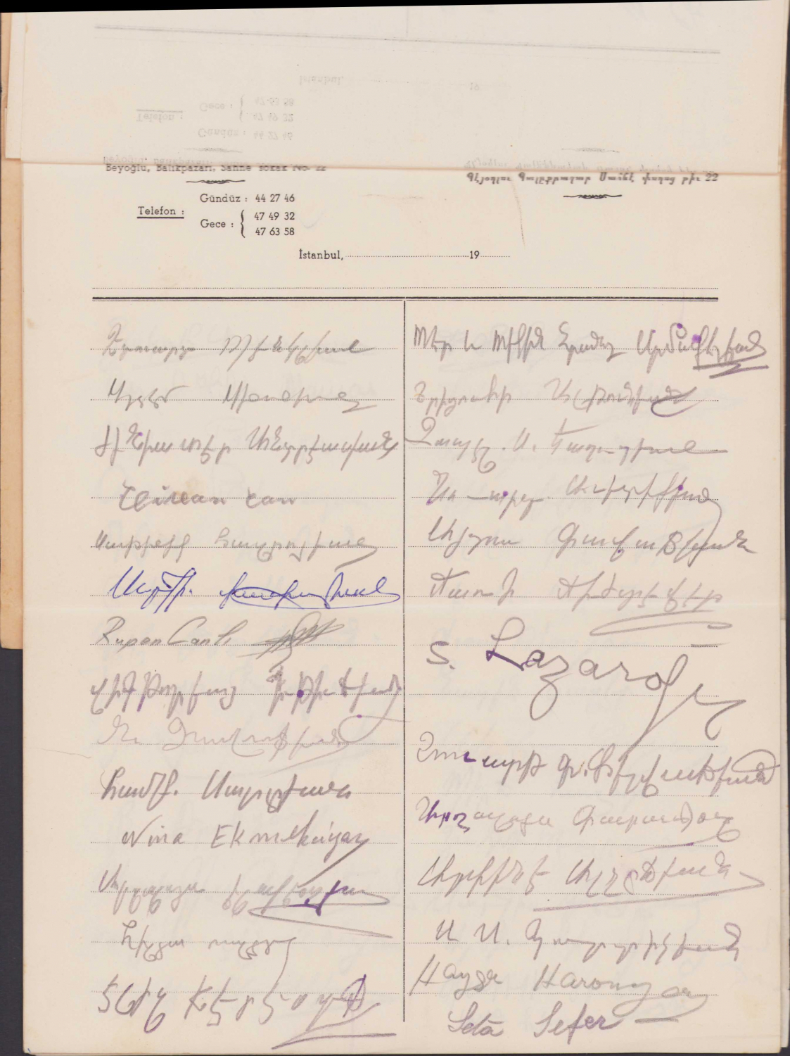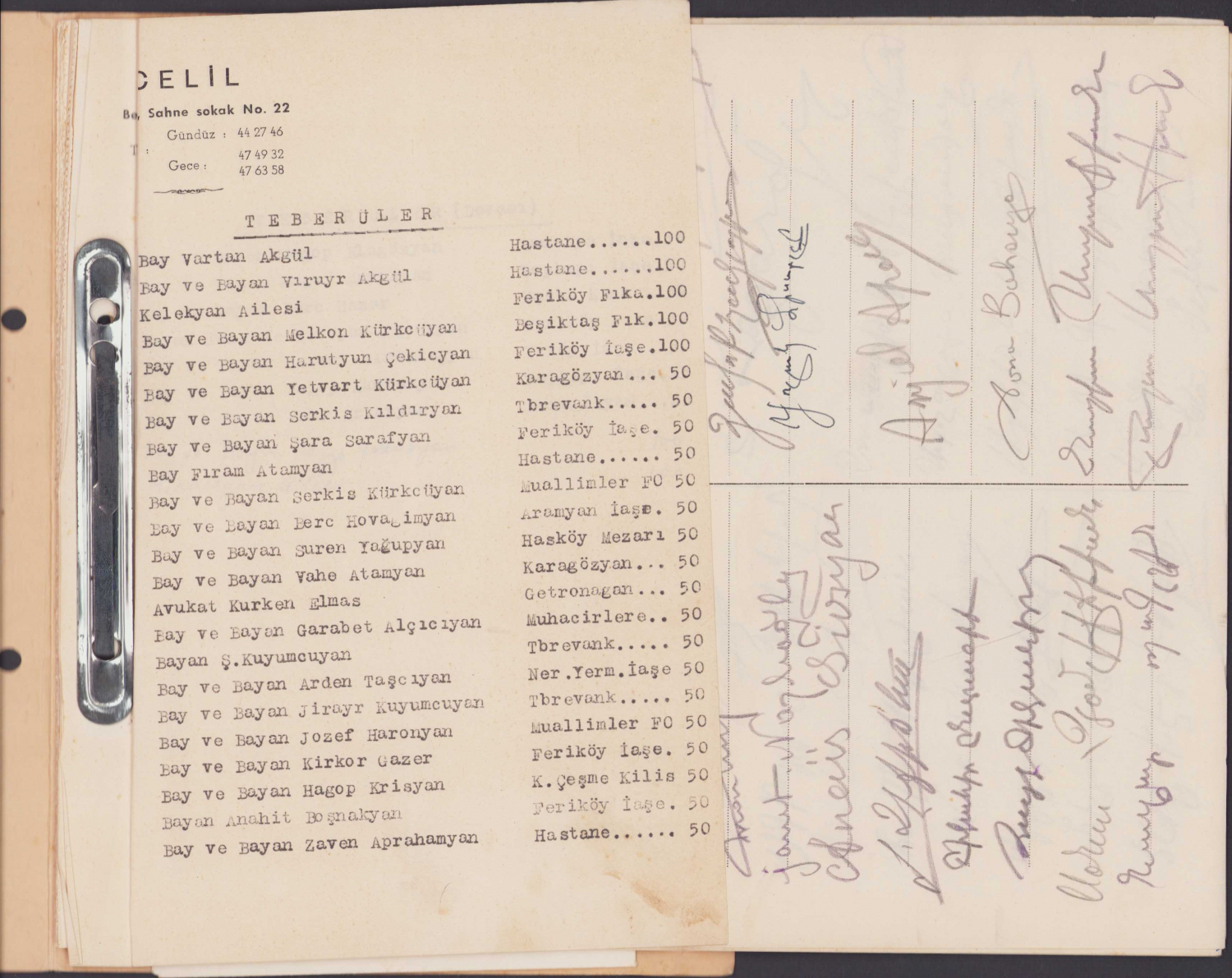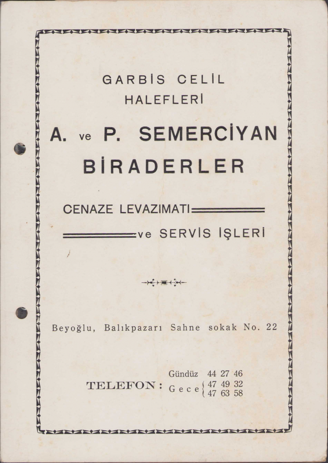 Ermenice kartvizit ve Garbis Celil Halefleri, A. ve P. Semerciyan Biraderler, Cenaze levazımatı ve servis işleri kaydı ve imzalı kartviziti, Beyoğlu adresli, bir Ermeni vatandaşın defin işlemi sırasında tutulan kayıtlar, 11 sayfa, 16x23cm