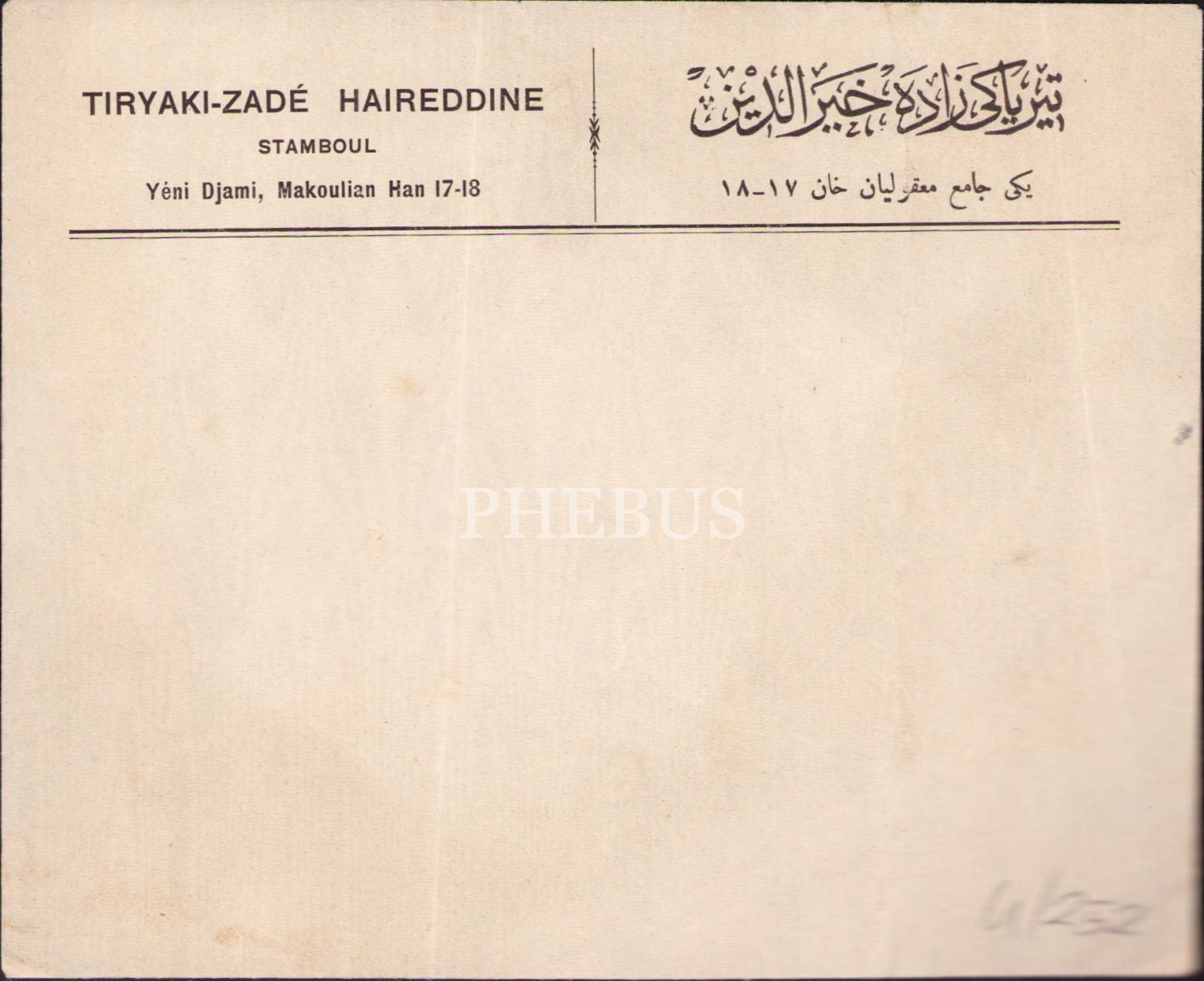 Tiryaki Zade Hayreddin İstanbul [Stamboul] antetli Osmanlıca - Fransızca ili dilde zarf