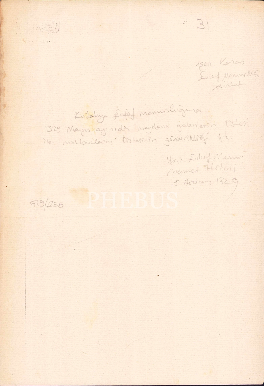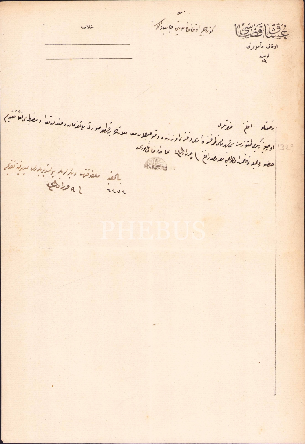 Uşak Kazası Evkaf Memurluğu antetli Kütahya Evkaf Memurluğuna 1329 Mayıs ayında meydana gelenlerin listesi ile makbuzların listesinin gönderilmesi hakkında Osmanlıca evrak, 22x32 cm
