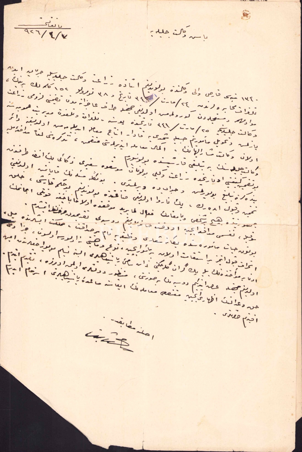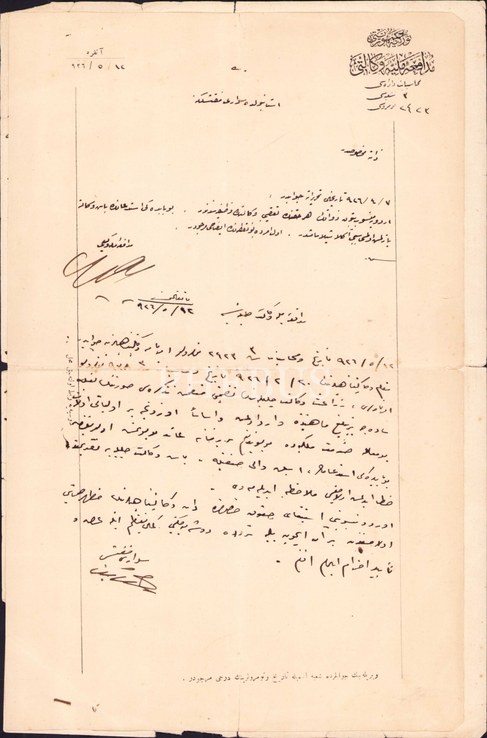 Müdafaai Milliye Vekaleti antetli, İstanbul Süvari müfettişliğine gönderilmiş 1926 tarihli Osmanlıca evrak, kenarları haliyle, 20x33 cm