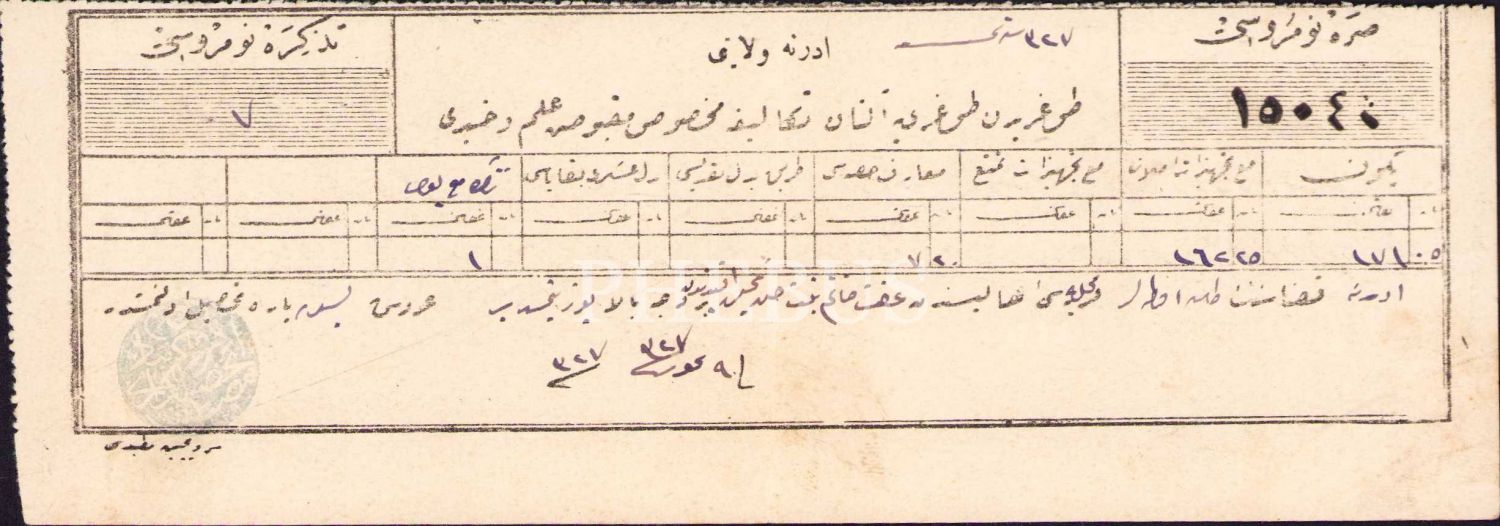 Osmanlıca 1327 senesi doğrudan doğruya alınan tekalife mahsus makbuz ilmuhaberi, Edirne, 20x6 cm