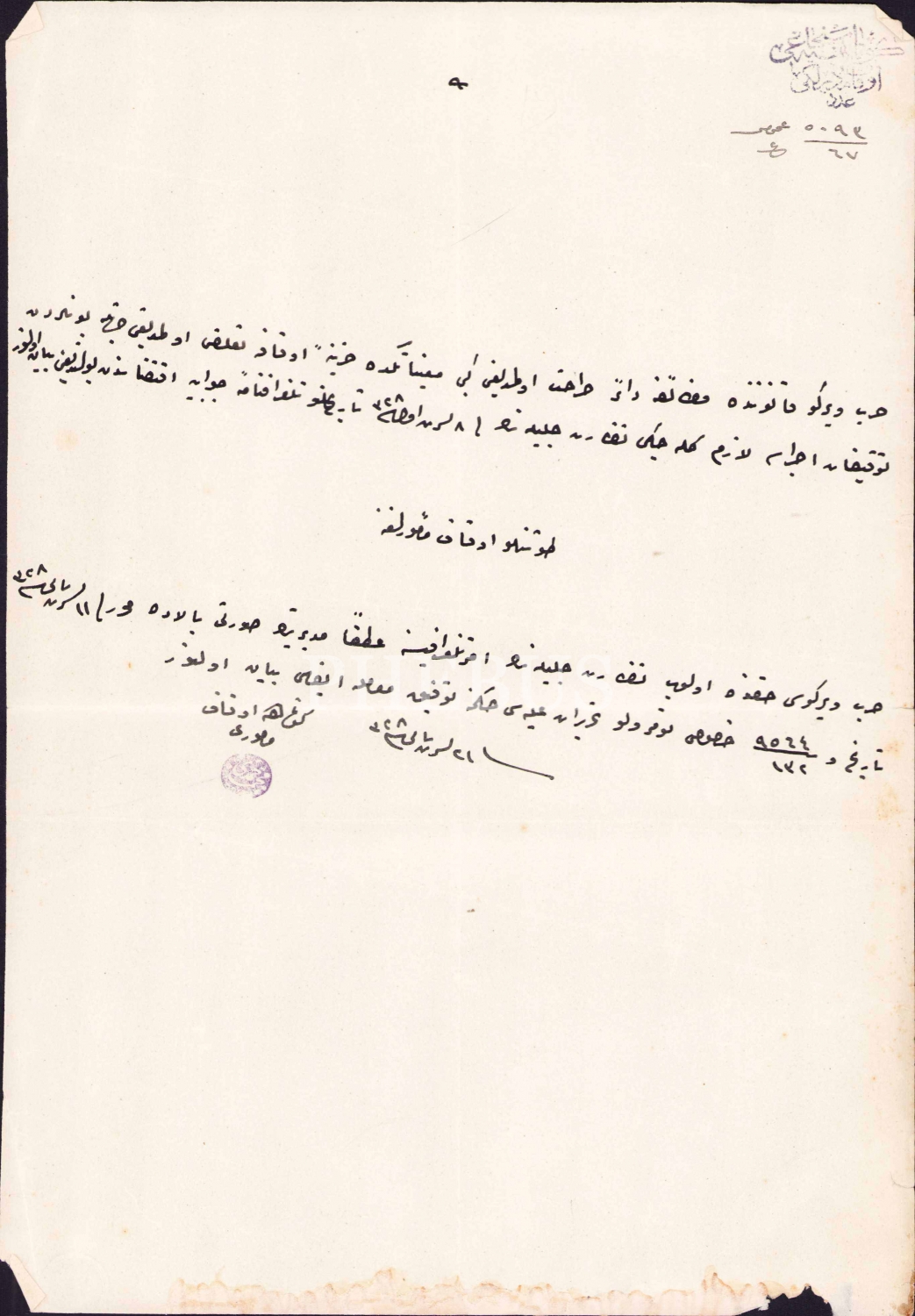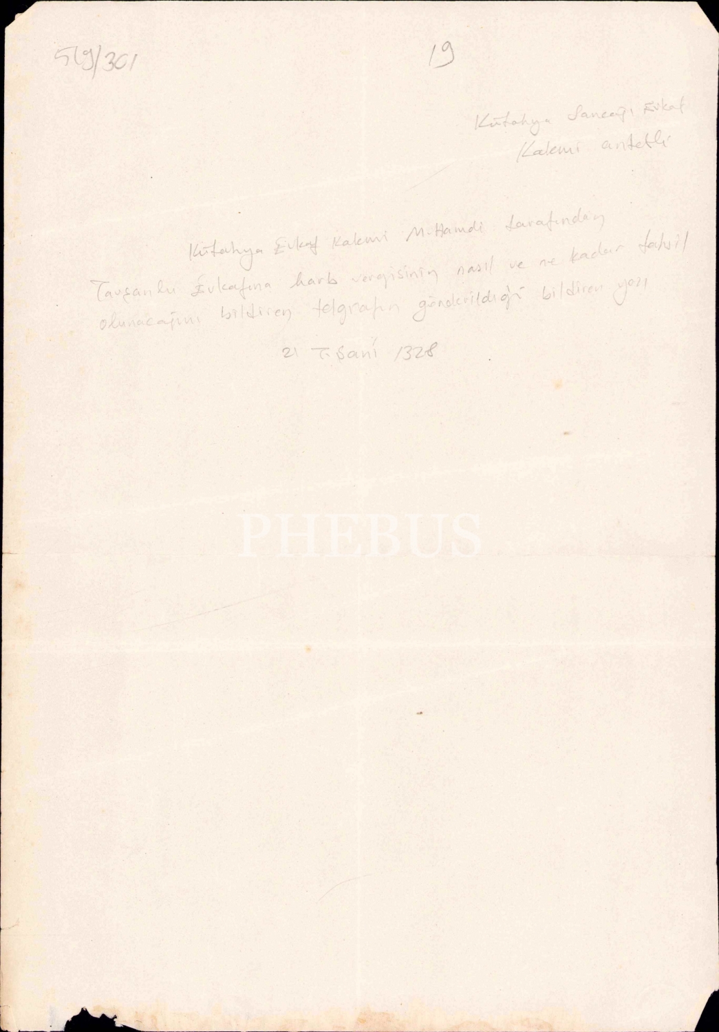 Kütahya Sancağı Evkaf Kalemi antetli M. Hamdi tarafından Tavşanlı Evkafına harb vergisinin nasıl ve ne kadar tahsil olunacağını bildiren telgrafın gönderildiğini bildiren Osmanlıca evrak, 22x32 cm