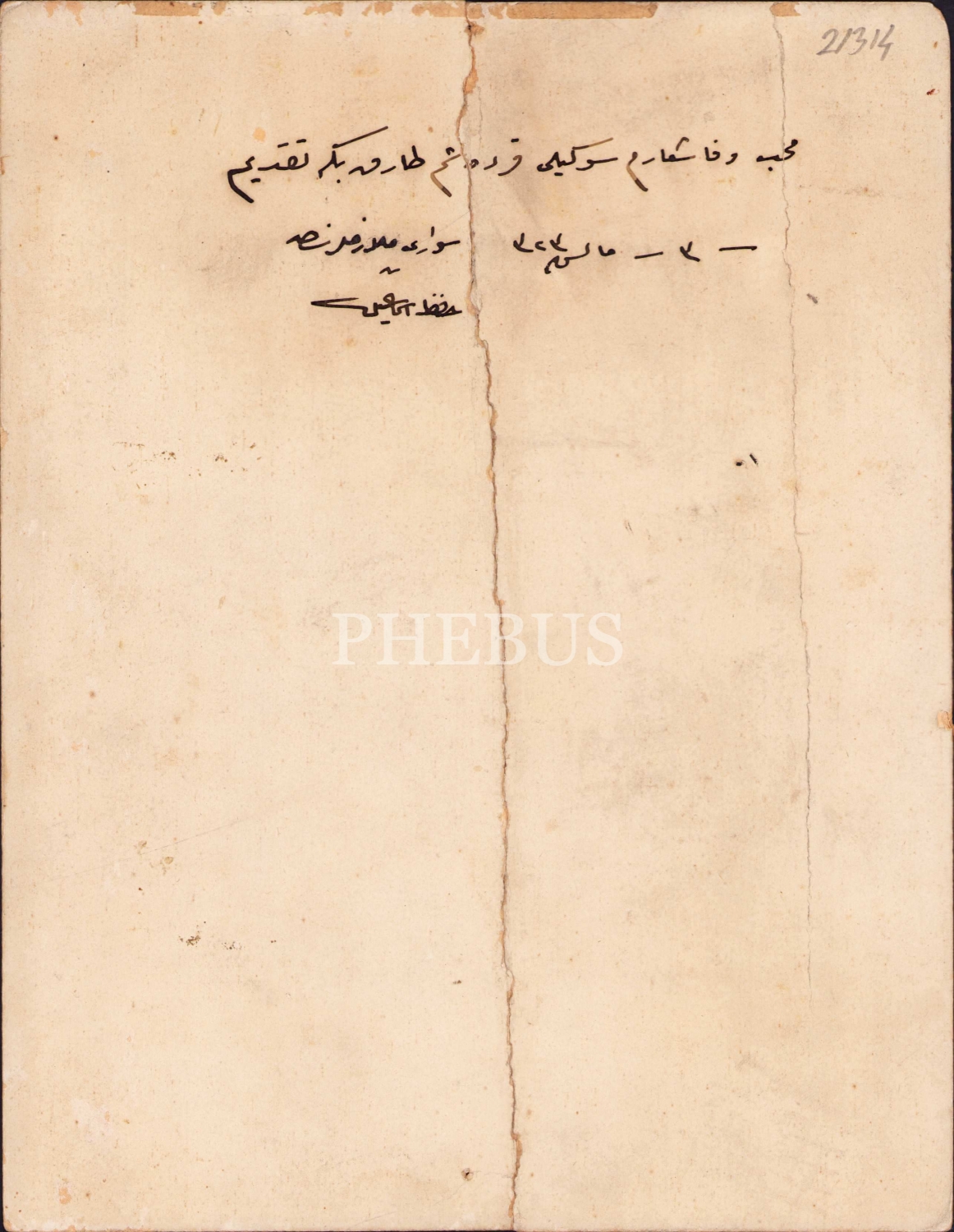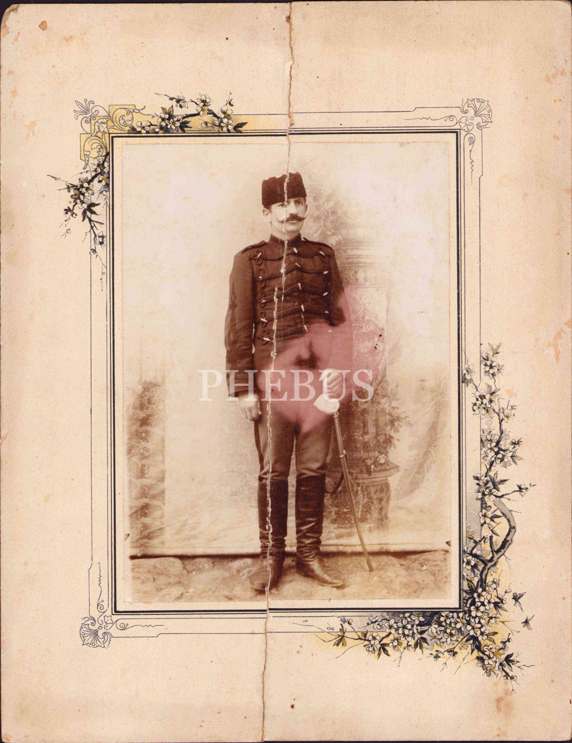 Kalpaklı Süvari Mülazımı Hafız İsmail kabin fotoğrafı, arkası Osmanlıca ithaflı, 1323 tarihli, ortadan kırık vaziyette, 13x18 cm
