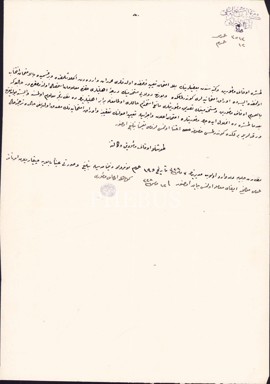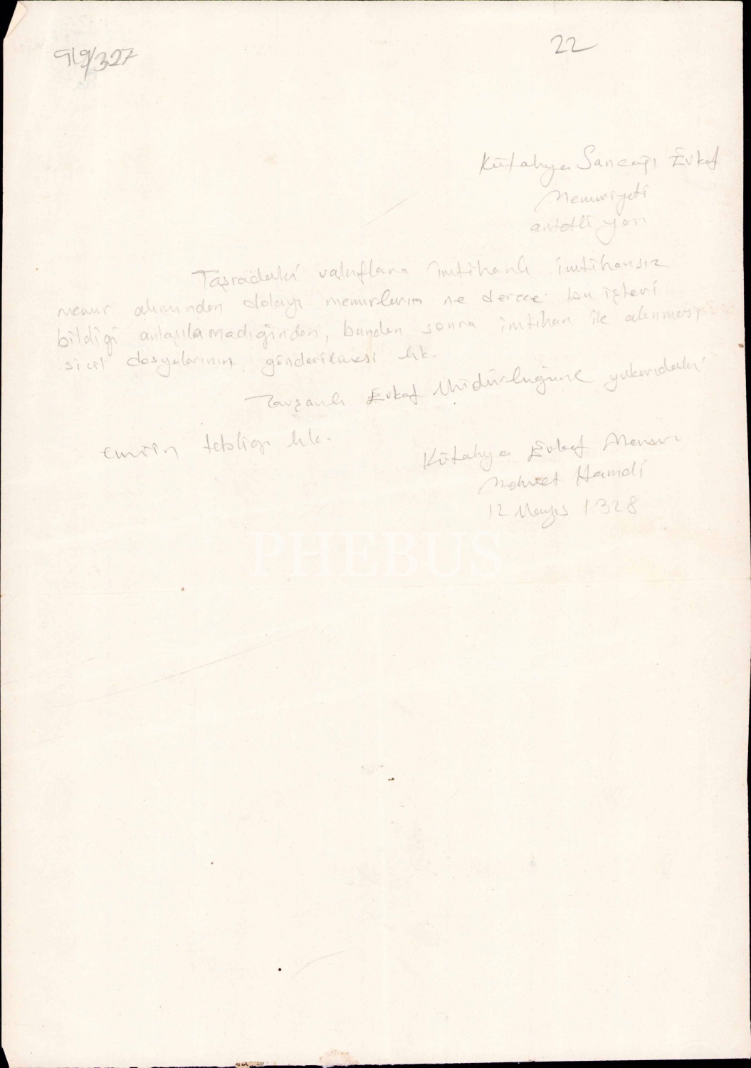 Kütahya Sancağı Evkaf Memuriyeti antetli Osmanlıca evrak, 1328 tarihli, 22x29 cm