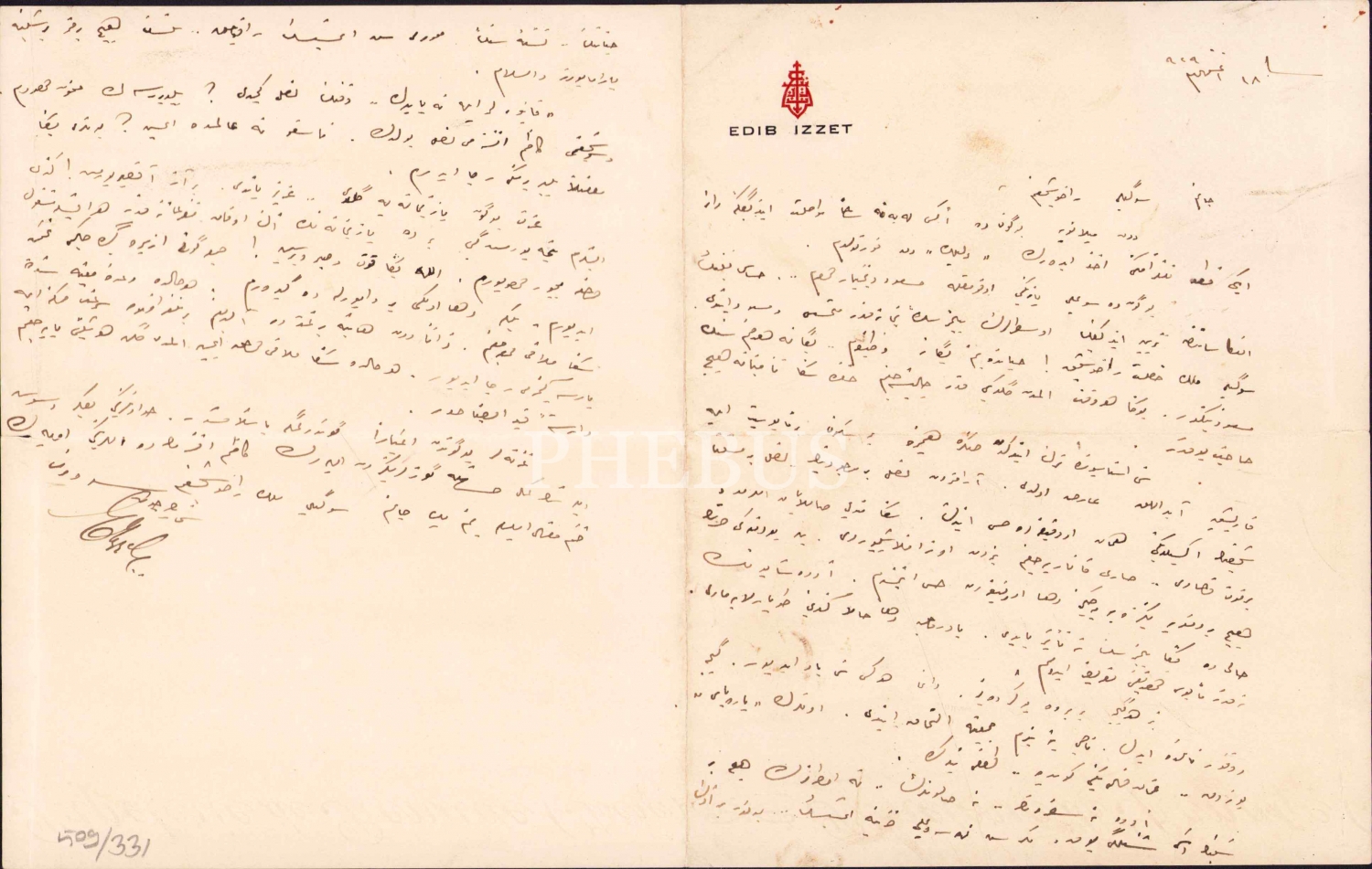 Edip İzzet antetli, 1929 tarihli, Sevgili Rahşancığım ithaflı, 2 adet Osmanlıca mektup, 17x20 cm