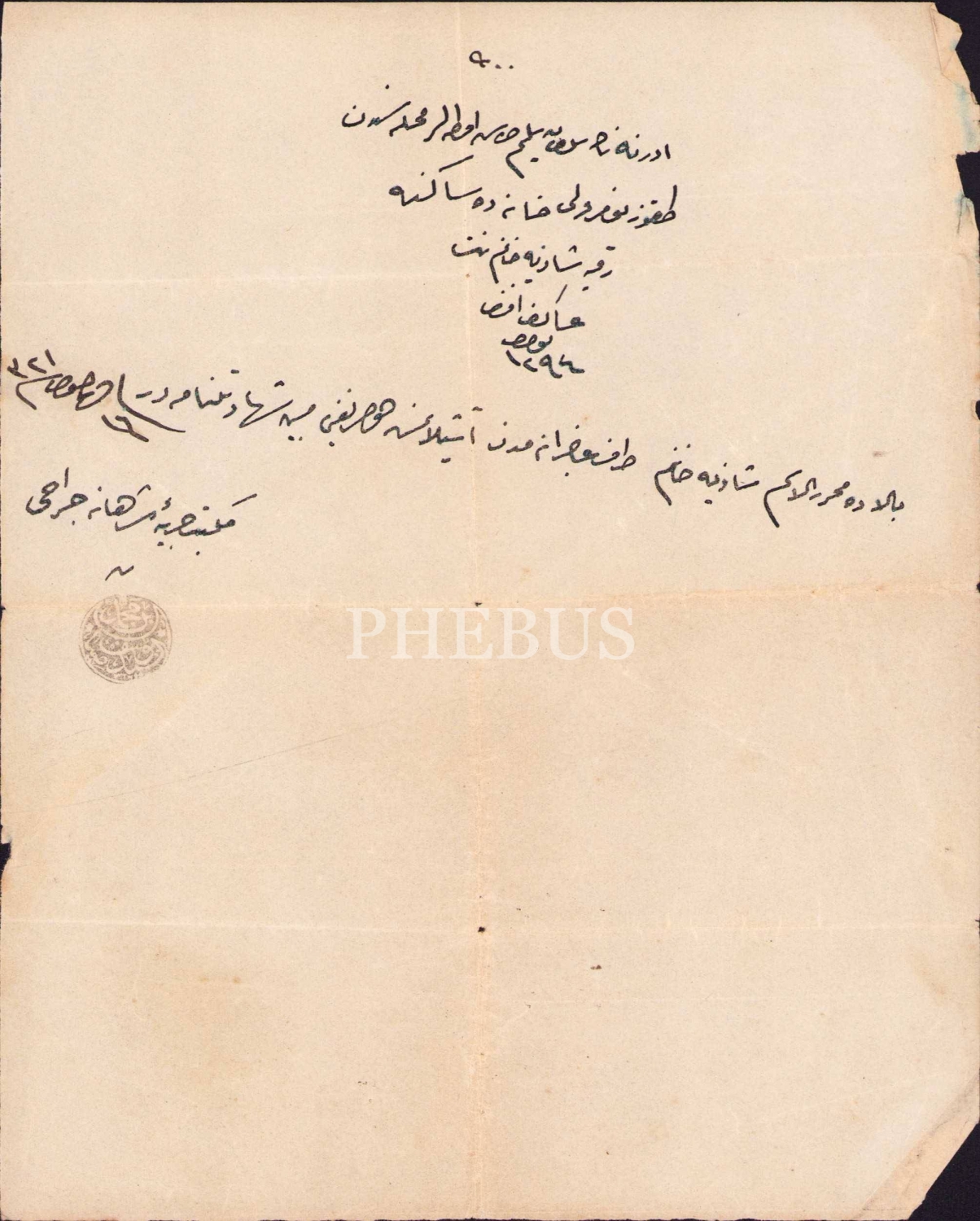 Edirne Taş Odalar Mahallesi sakini 9 numarada Rukiye Şaziye Hanım'ın ikametgahı, Osmanlıca 1321 tarihli, 15x21 cm