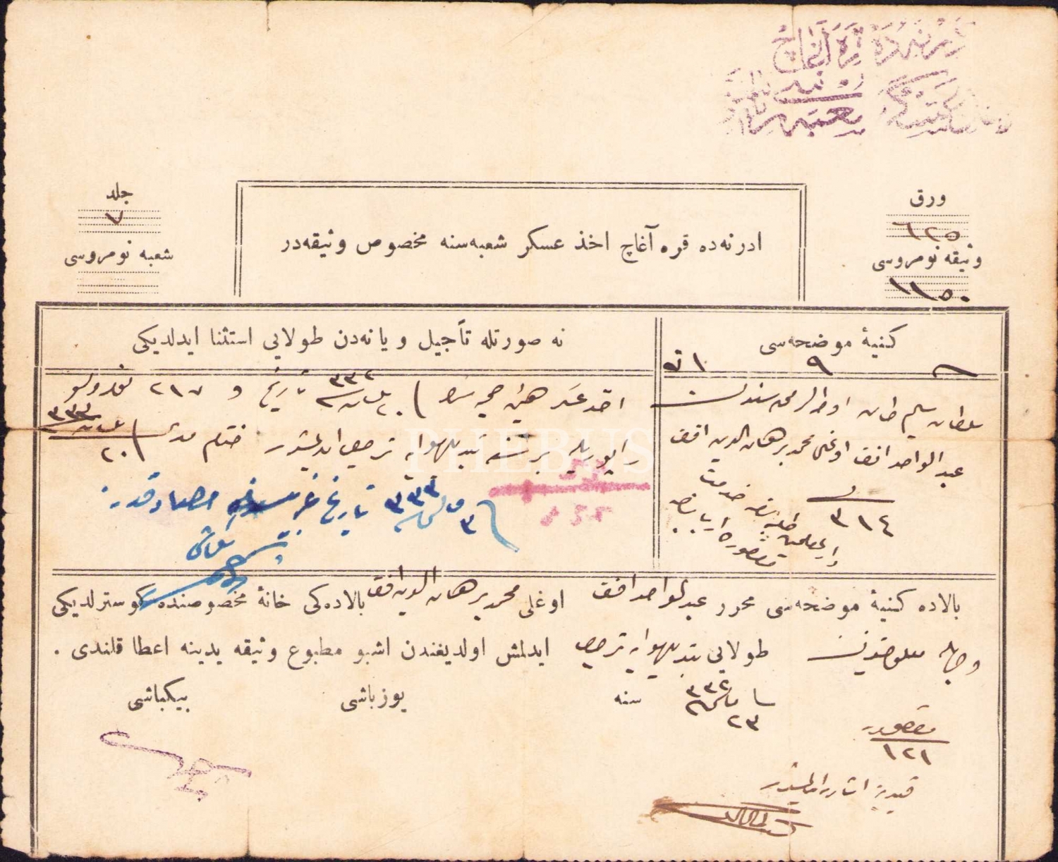 Osmanlıca Edirne'de Karaağaç Ahz-ı Asker şubesine mahsus vesika, 1332 tarihli, 16x13 cm