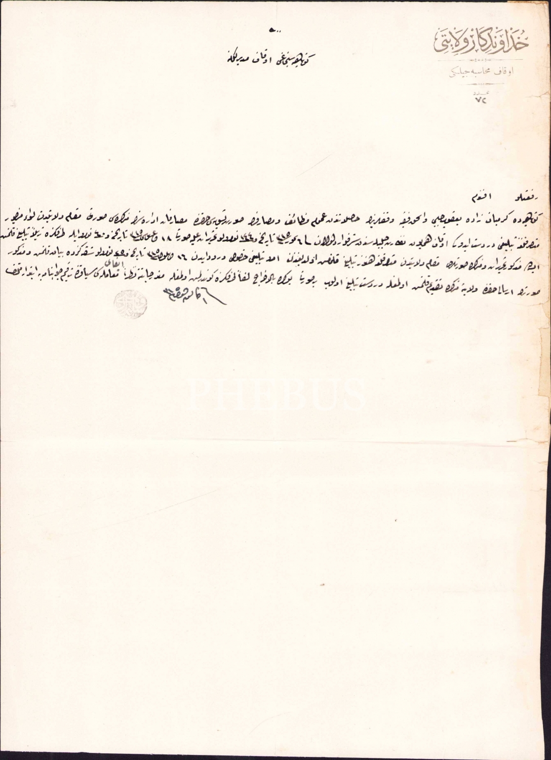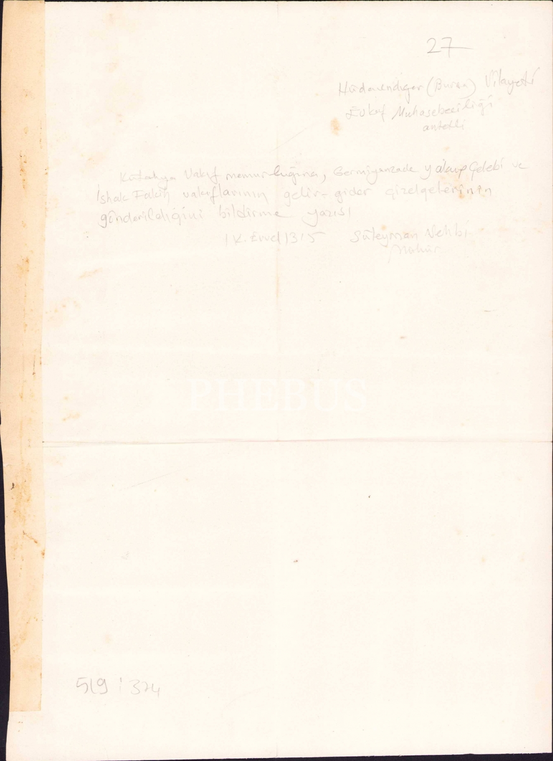 Hüdavendigar [Bursa] Vilayeti Evkaf Muhasebeciliği antetli, Kütahya Vakıf Memurluğuna, Germiyanzade Yakup Çelebi ve İshak Fakih vakıflarının gelir - gider çizelgelerinin gönderildiğini bildirme yazısı, Süleyman Vehbi mühürlü, 1315 tarihli, 22x32 cm