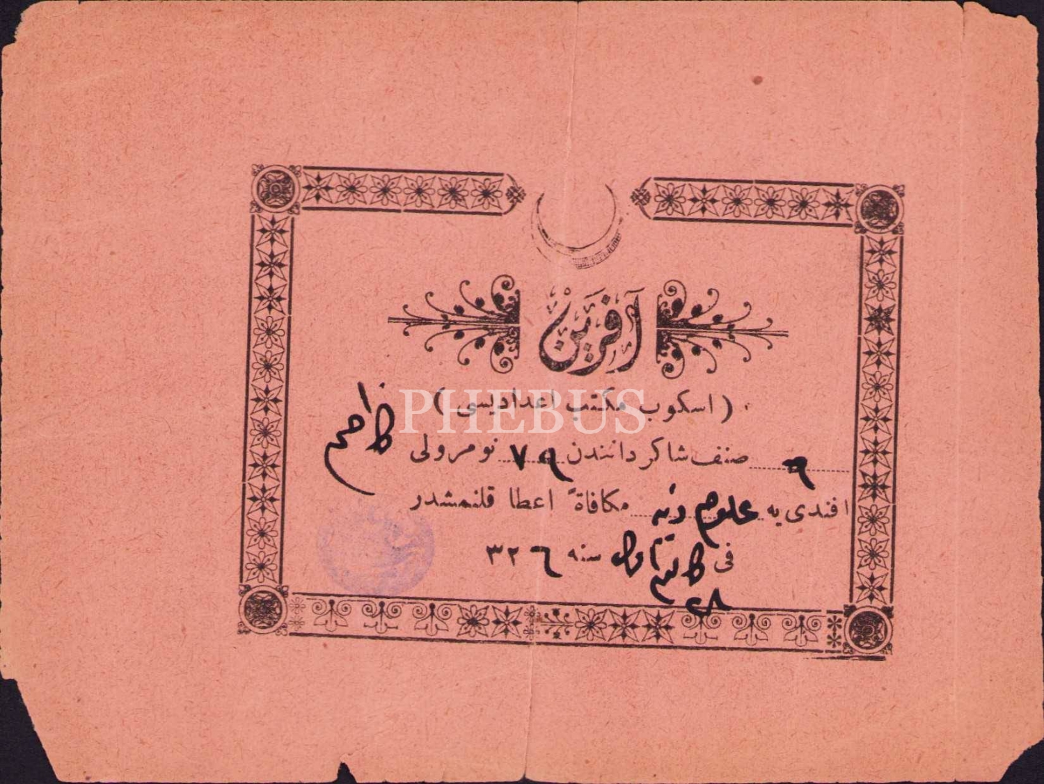 Osmanlıca aferin, Üsküb Mekteb-i İdadisi, 1326 tarihli, kenarları yırtık, 13x10 cm