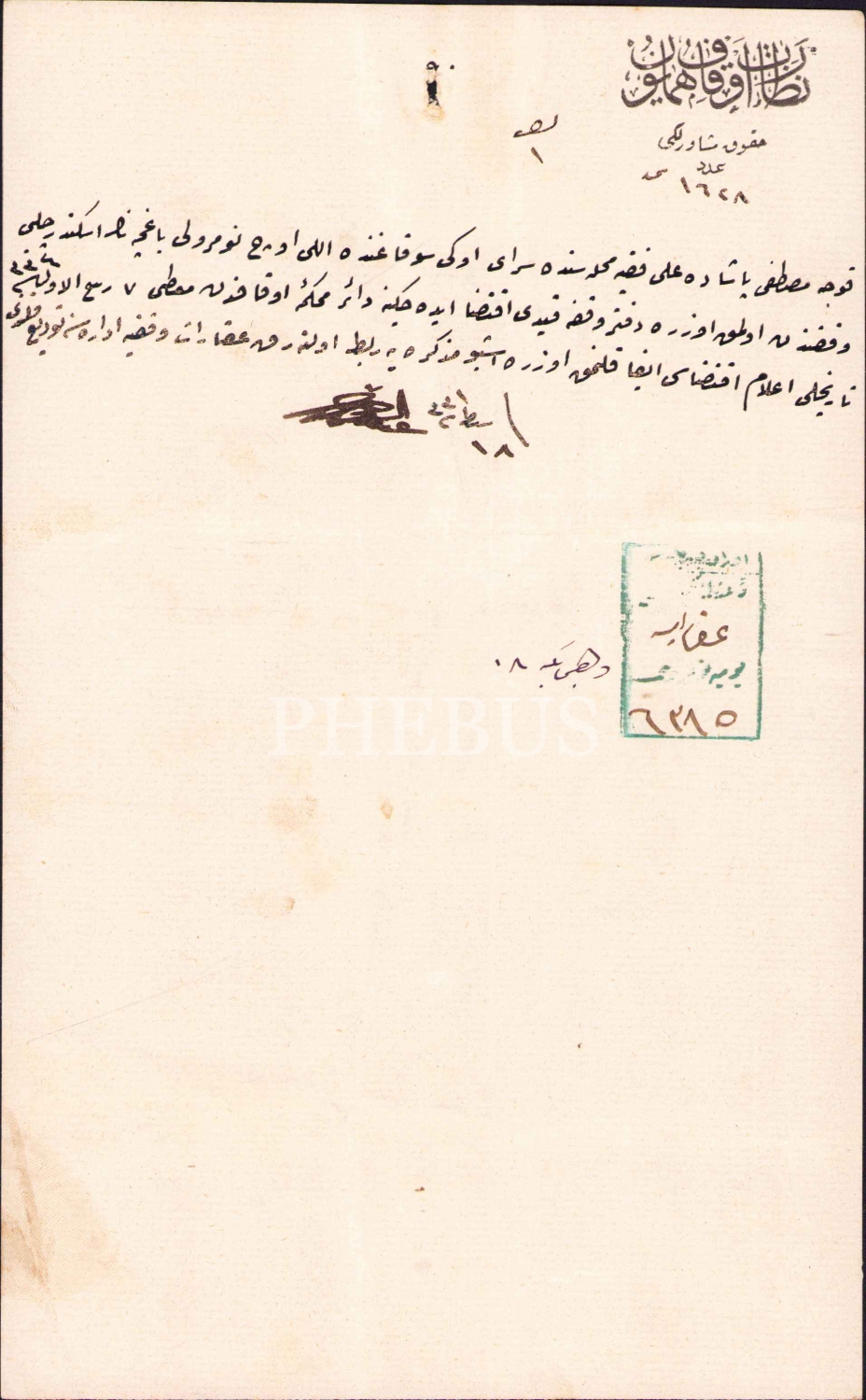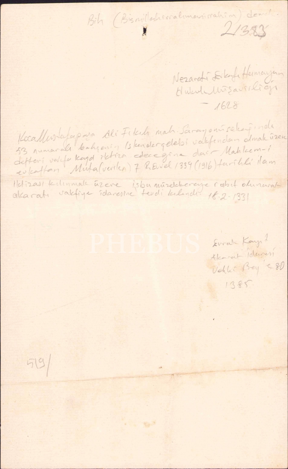 Nezaret-i Evkaf-ı Hümayun Hukuk Müşavirliği antetli Kocamustafapaşa Ali Fıkıh mahallesindeki 53 numaralı bahçenin İskender Çelebi Vakfından olmak üzere deftere kayıt edileceği üzerine 1331 tarihli Osmanlıca mahkeme kaydı, 16x27 cm