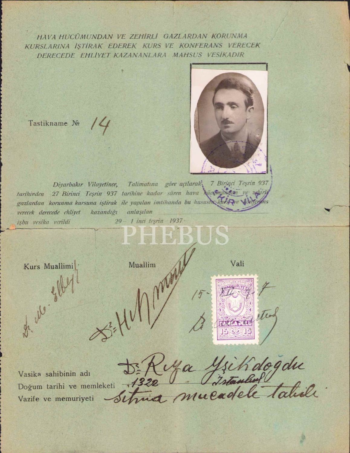 Hava Hücumundan ve Zehirli Gazlardan Korunma Kurslarına iştirak ederek kurs ve konferans verecek derecede ehliyet kazananlara mahsus vesika, 1937, 18x22 cm