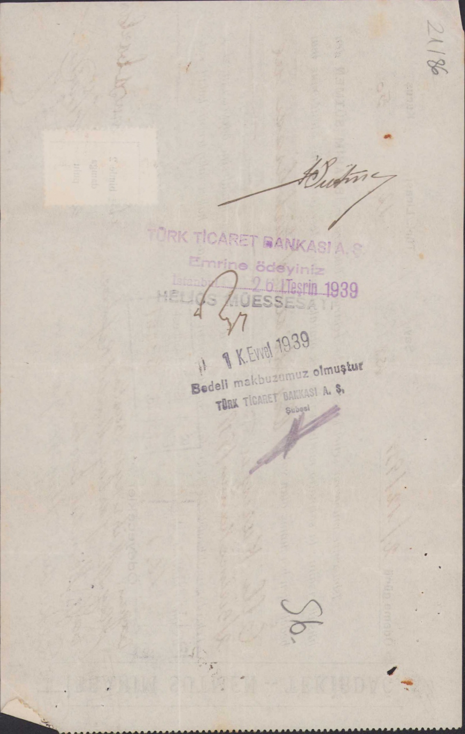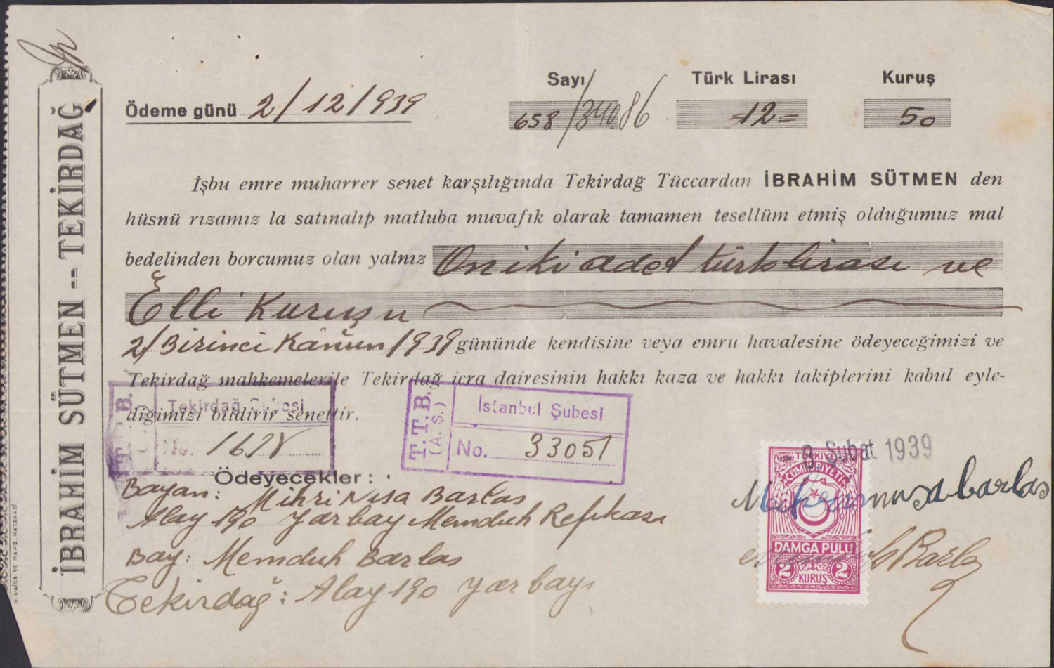 İbrahim Sütmen Tekirdağ antetli senet, 1939 tarihli, pullu, 21x13,5cm