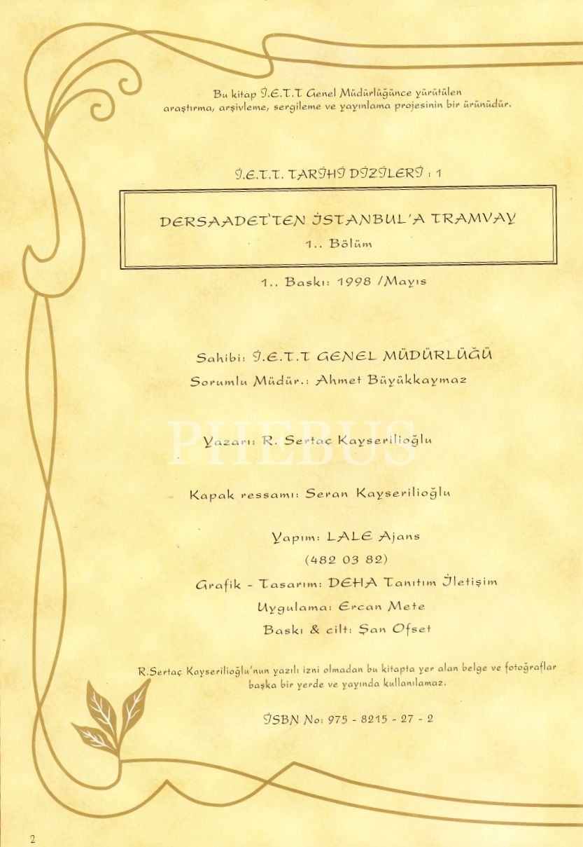 Dersaadet'ten İstanbul'a Tramvay I, R. Sertaç Kayserilioğlu, İ.E.T.T Genel Müdürlüğü dizilerinin 1. ve 2. bölümü. İlk baskı 1998, 218+273 sayfa, 23x31 cm