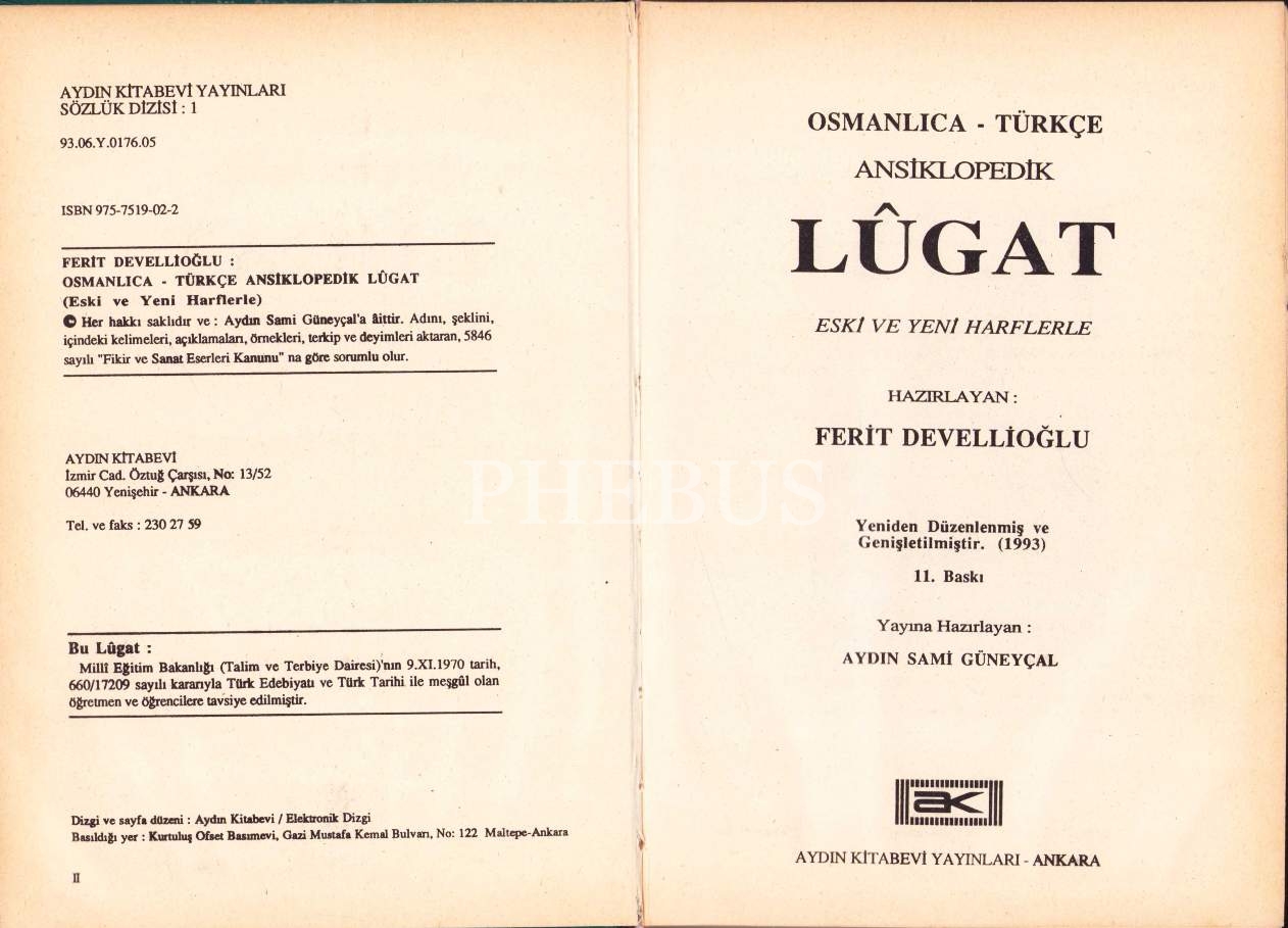 Osmanlı - Türkçe Ansiklopedik Lugat, Ferit Develioğlu, 11. baskı, Ankara 1993, 1194 sayfa, 16x25 cm