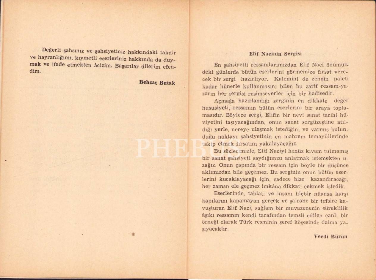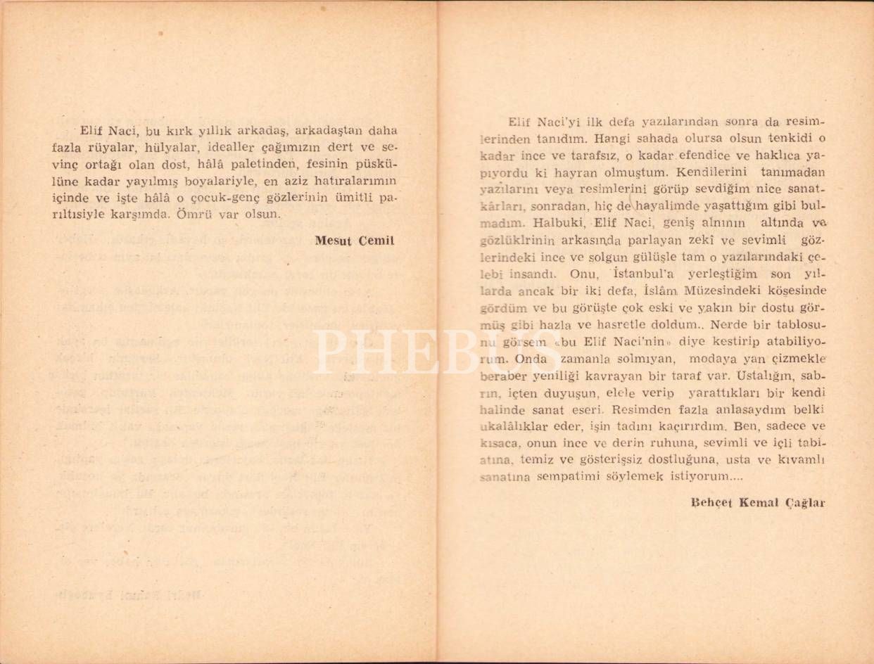 İthaf, "Yüksel Hanımefendi'ye hürmetlerimle, Elif, 1954" şeklindedir. Kitabın içerisinde 34 yazar, düşünür ve çizerin ressam Elif Naci hakkındaki yazıları mevcuttur. Elif Naci, ilköğrenimini, çocukluğunun geçtiği Edirne’de tamamladı. Sekiz yaşındayken geldiği İstanbul’da Ayasofya Rüştiyesi (Ortaokulu) ile Vefa Sultanisini (Lisesini) bitirdi. Sanayi-i Nefise Mekteb-i Âlisi’nin Resim Bölümüne girerek İbrahim Çallı’nın öğrencisi oldu. (1913). Birkaç ay sonra Birinci Dünya Savaşı çıktı ve askere alındığı için dört yıl aradan sonra eğitimine devam edebildi. Öğrenciliği sırasında geçinebilmek için arşiv memuru olarak gazeteciliğe başladı. Çeşitli sanat yazıları yazarak polemist oldu. İleri, İkdam, İfham, Milliyet, Tan, Son Telgraf ve Cumhuriyet gazetelerinde çalıştı. Akademiden mezun oluşunun ardından Türk ve İslâm Eserleri Müzesine önce müdür yardımcısı, sonra müdür oldu. Ressam olarak ilk kişisel sergisini Alay Köşkü’nde açtı (1930). Sanat hayatına asıl girişi 1933’te açılan, kurucuları arasında bulunduğu, D Grubunun ilk sergisiyle oldu. Bu grubun içinde yurtdışında da çeşitli karma sergilere katıldı. İkinci kişisel sergisini Eminönü Halkevi’nde (1947), üçüncüsünü ise retrospektif olarak Galatasaray Lisesi girişinde açtı (1951). Aynı dönemde Paul Klee, George Braque gibi çağdaş ressamlardan ve Hafız Osman, Mehmet Esat gibi hat sanatçılarından etkilendiği söylenebilir. 1940'lardan sonra batı sanatının etkisinden sıyrılıp doğuya yönelerek hat sanatı soyutlamalarıyla ilgilendi. 1937’de Türk ve İslâm Eserleri Müzesi’nde, iki yıl sonra Topkapı Sarayı Müzesi’nde müdür yardımcılığı yaptı. 13 Temmuz 1963’te emekli oldu. Müzecilik hayatının bir bölümünde, basında da görev yaptı.
