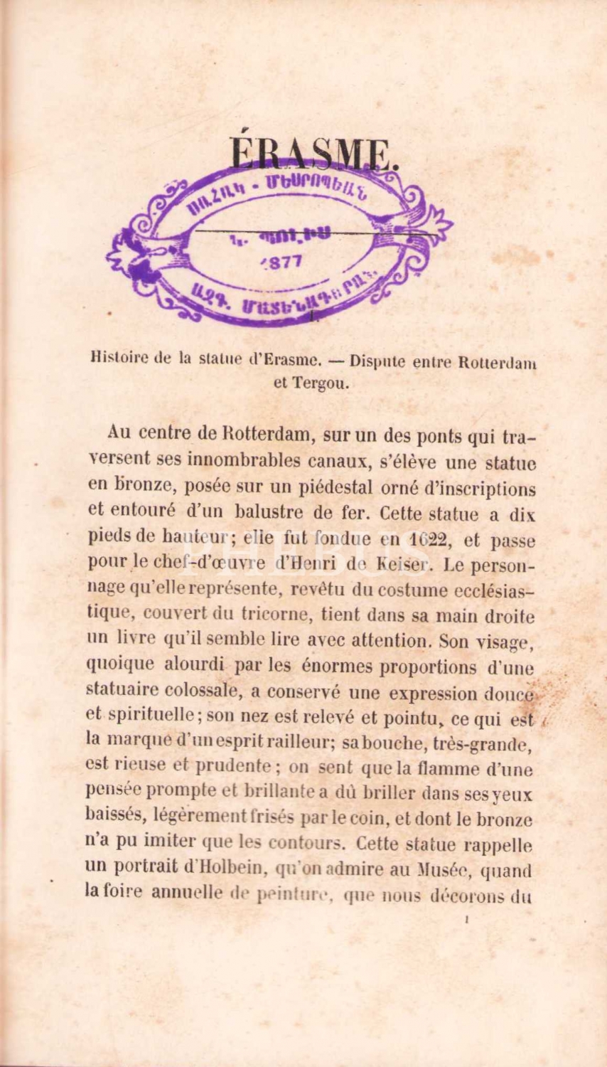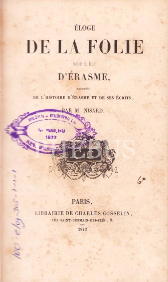 Eloge De La Folie [Deliliğe Övgü], Erasmus, Par M. Nisard, Fransızca, Ermenice damgalı, 1843 tarihli, 503 sayfa, 10x18 cm