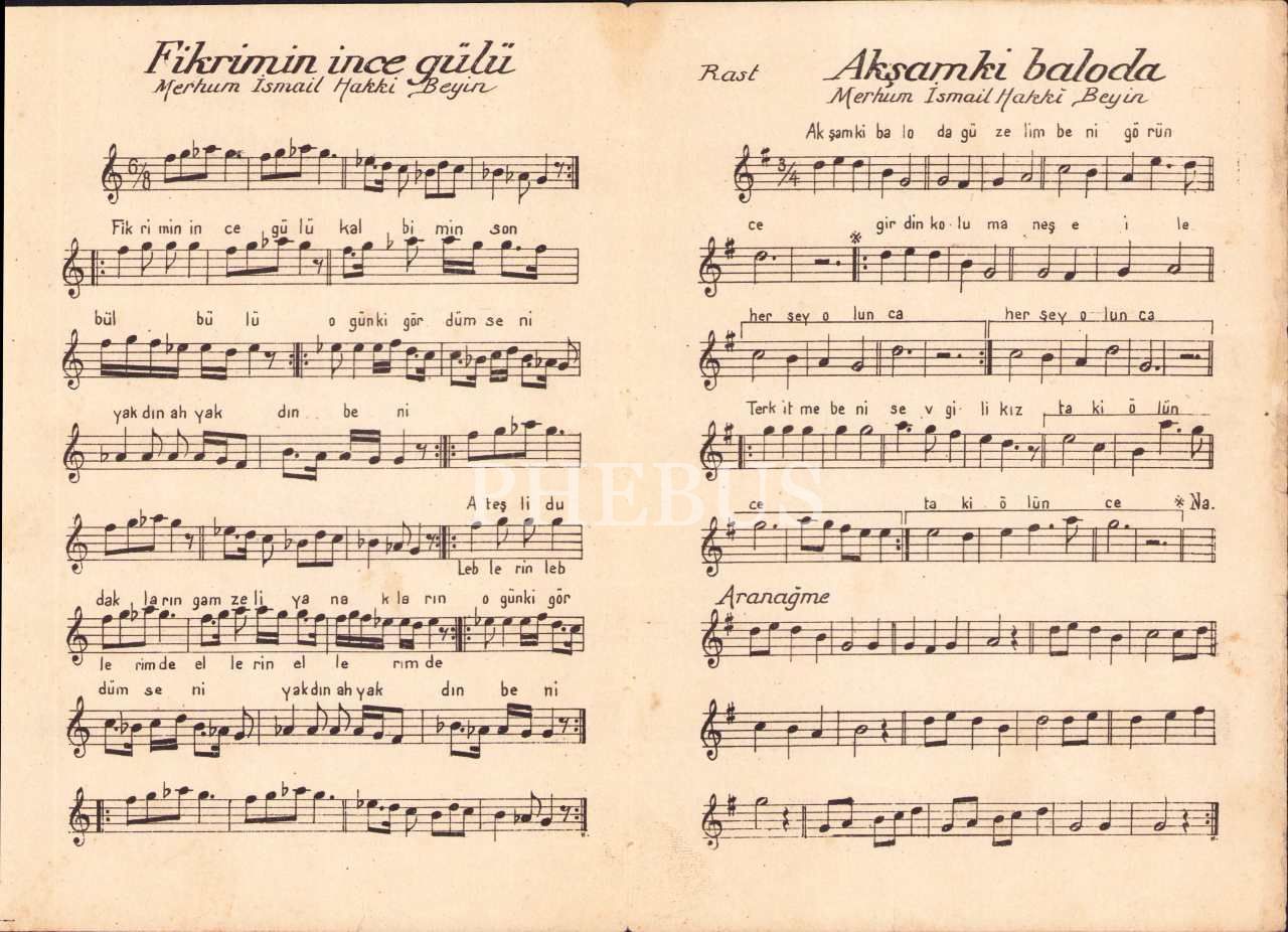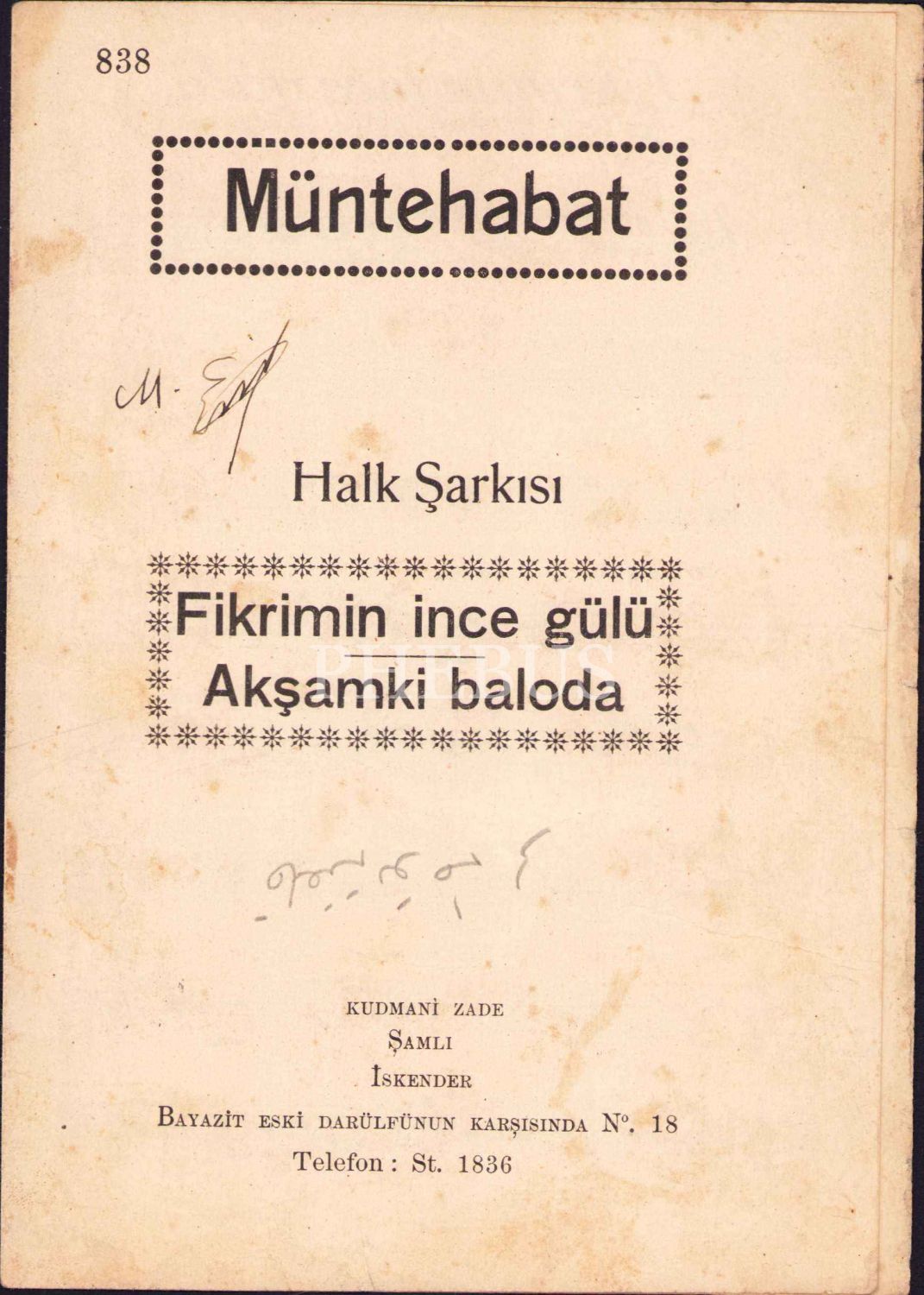 Nota: Müntehabat - Halk Şarkısı, Fikrimin İnce Gülü - Akşamki Baloda, Kudmani Zade Şamlı İskender, 4 sayfa, 14x20 cm