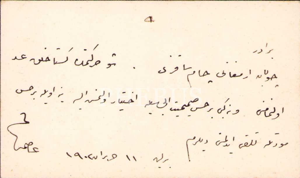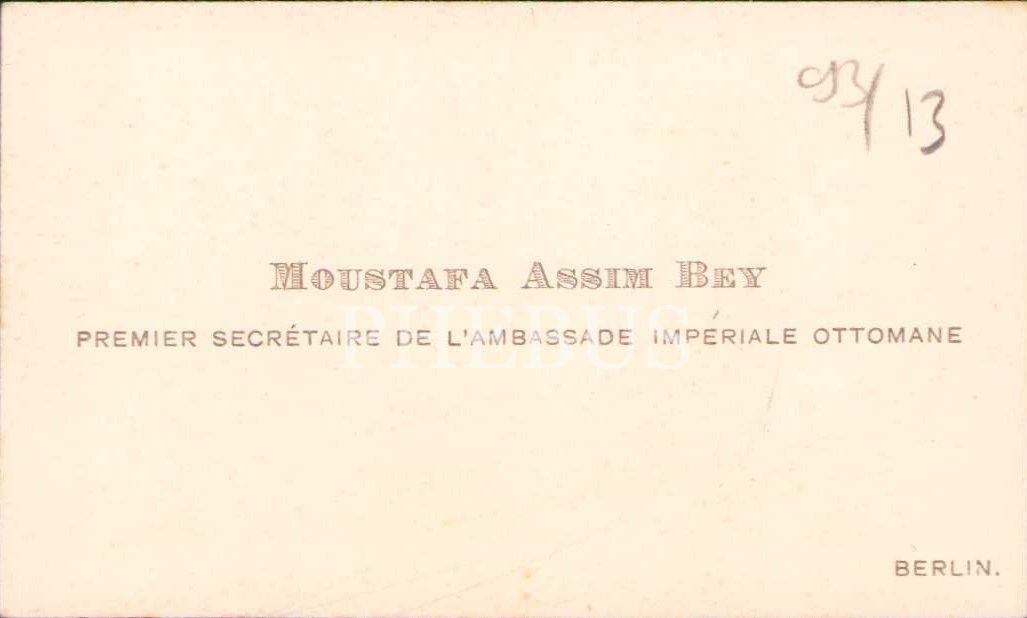 Moustafa Assim Bey yazılı kartvizit, arkası Osmanlıca yazılı, 9x5 cm