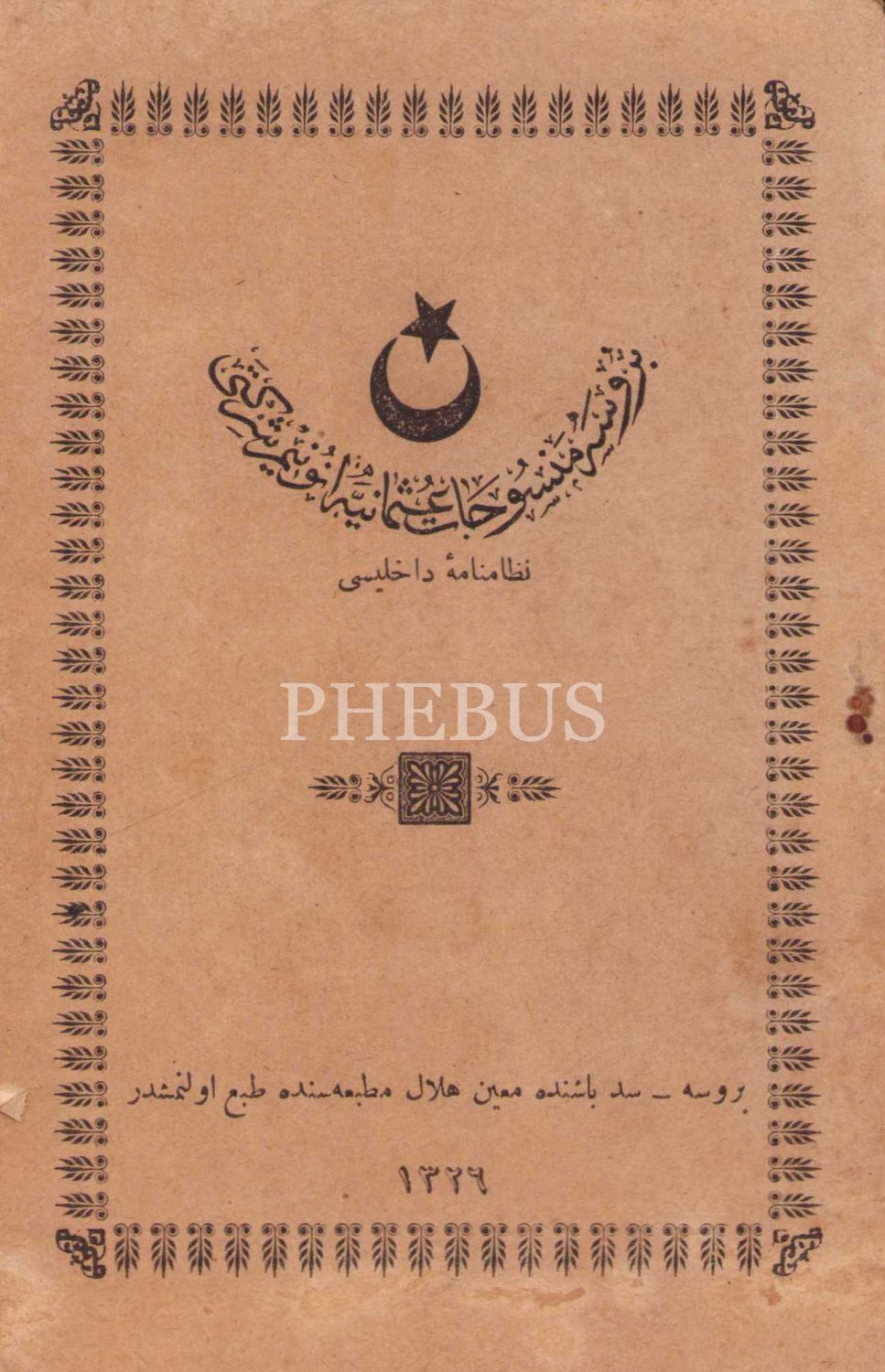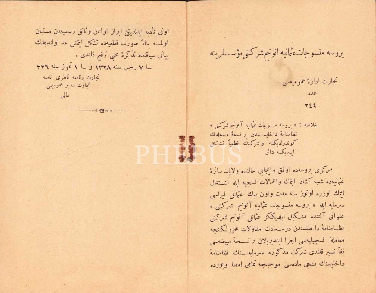 Osmanlıca Bursa Mensucat-ı Osmaniye Anonim Şirketi Nizamname-i Dahiliyesi, Hilal Matbaası, Bursa 1326, 20 sayfa, 10x17 cm