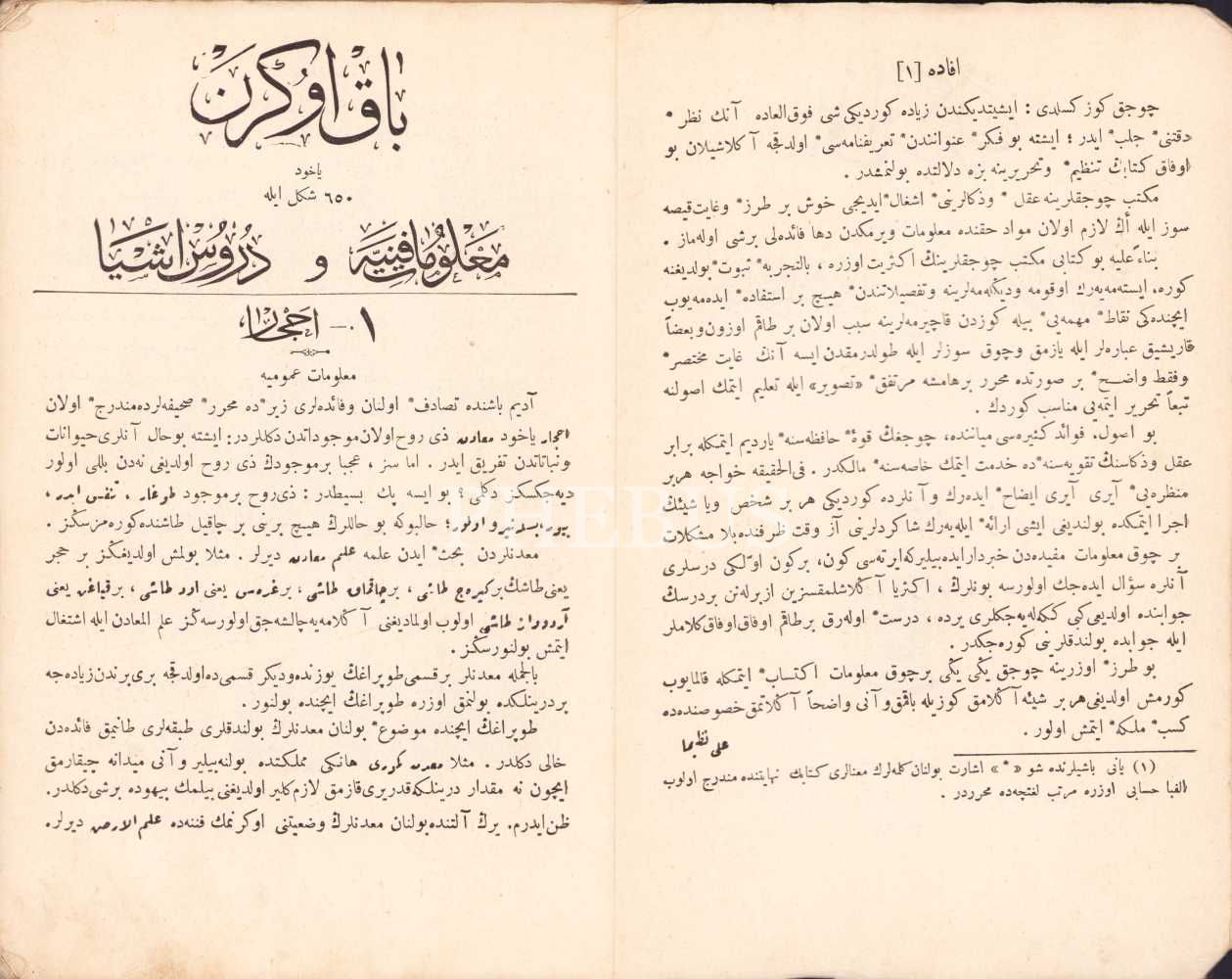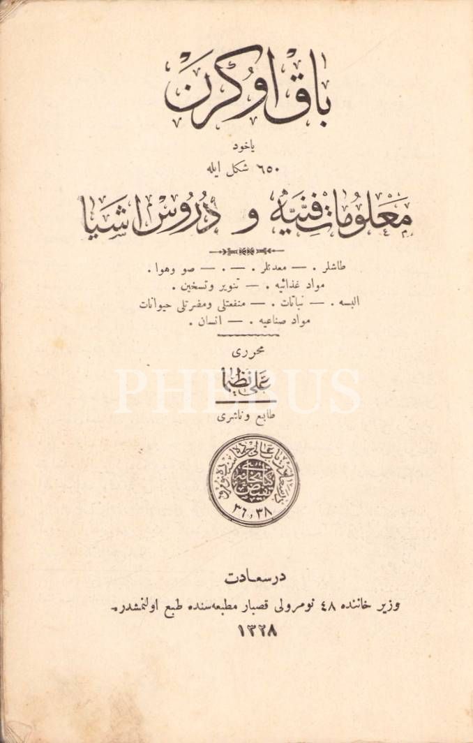 Osmanlıca Bak Öğren Yahud 650 Şekil İle ile Malûmât-ı Fenniyye ve Dürûs-i Eşya, Ali Nazima, Kasbar Matbaası, İstanbul 1328, 147 sayfa, 14x21 cm, ÖZEGE; 1602