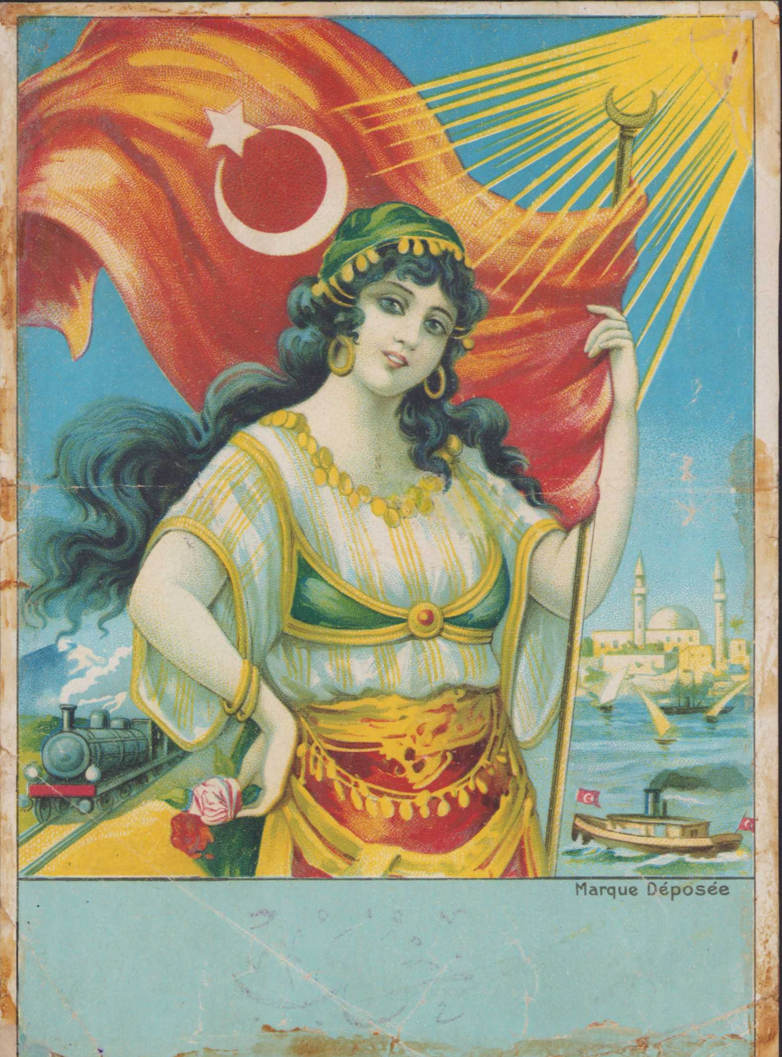 Kadın, bayrak, tren ve İstanbul temalı küçük Osmanlı afiş, 13,5x18,5cm