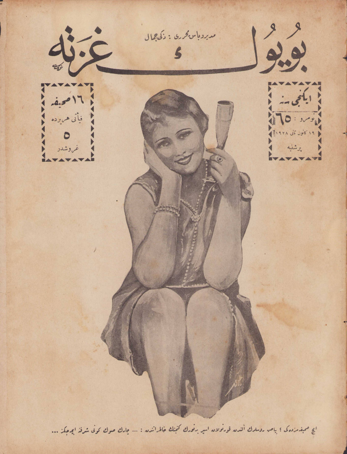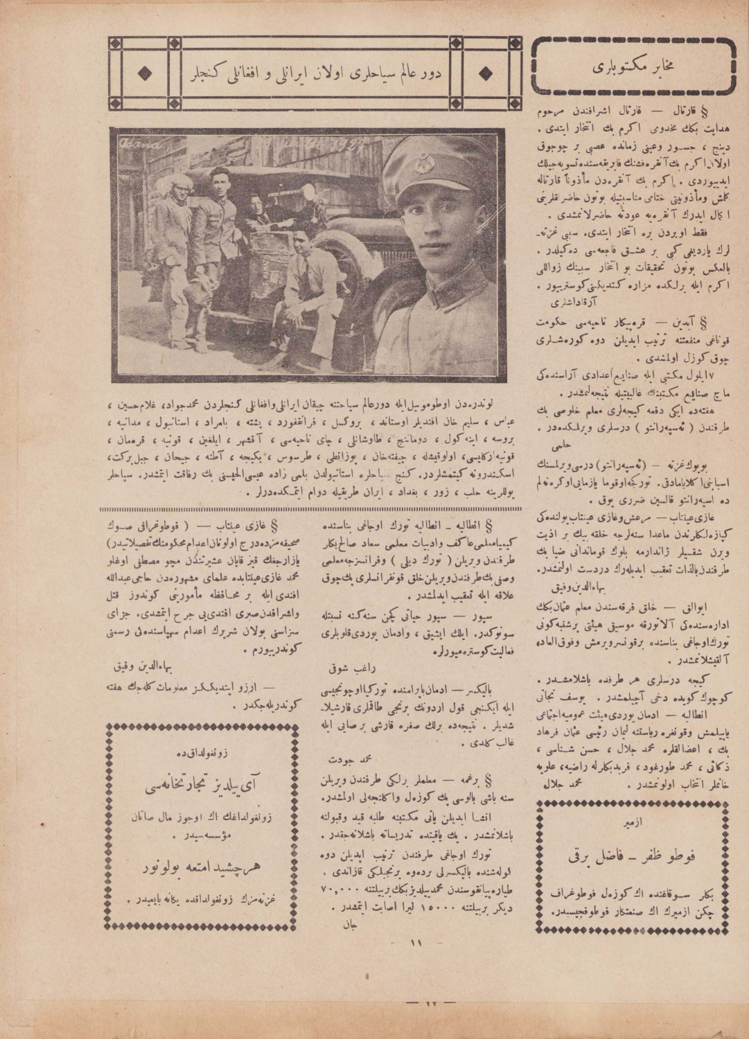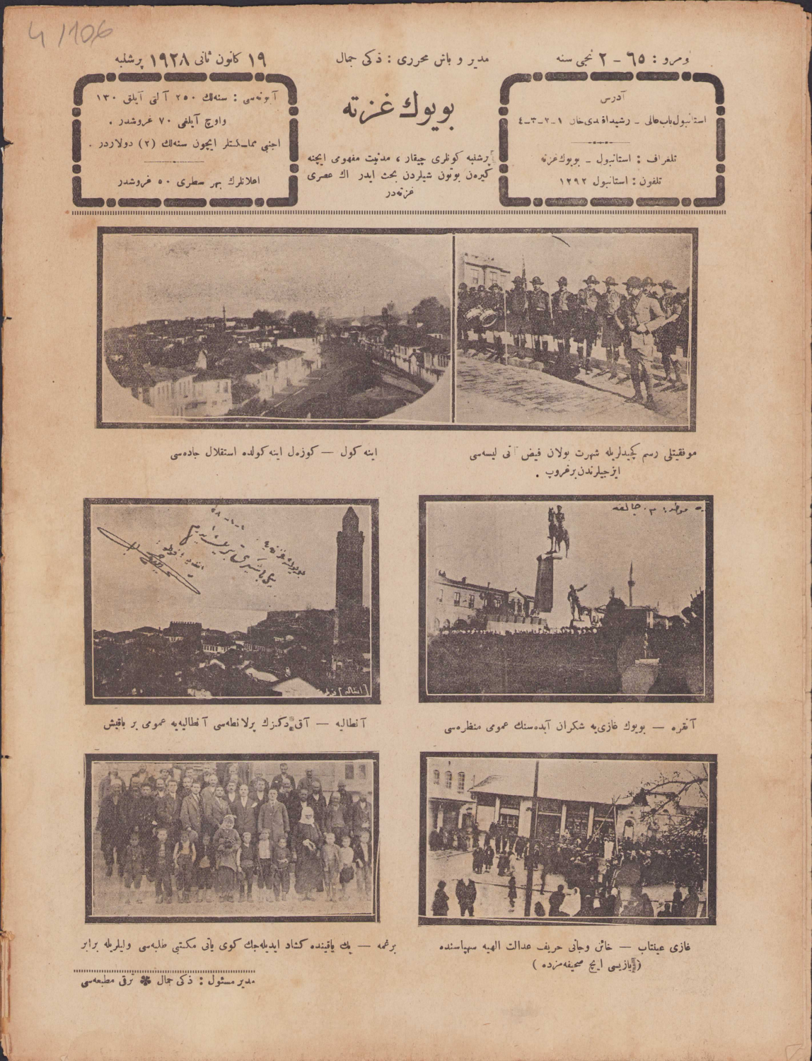 Osmanlıca Büyük Gazete, 1928 tarihli, ön kapakta gazetenin genel konusu olan Ruslardan kaçan esir türklere dair özet, arka kapakta İnegöl, Ankara, Antalya, Bergama şehirlerden genel görünüm, 16 sayfa, 23x32cm