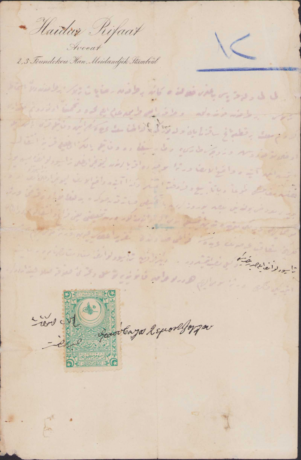 Avukat Haydar Rıfat - İstanbul antetli Osmanlıca yazılı doküman, pullu, 13x20cm