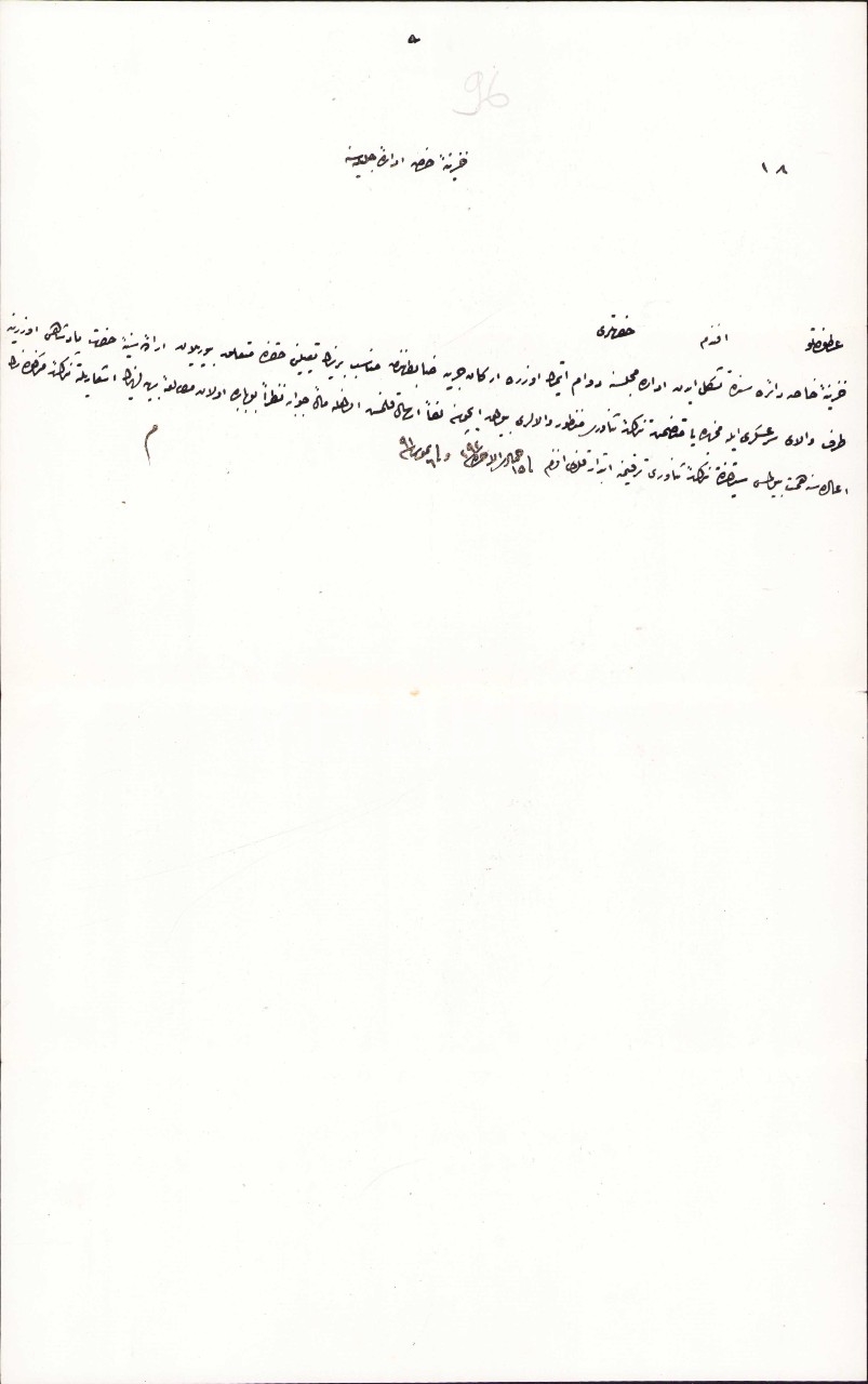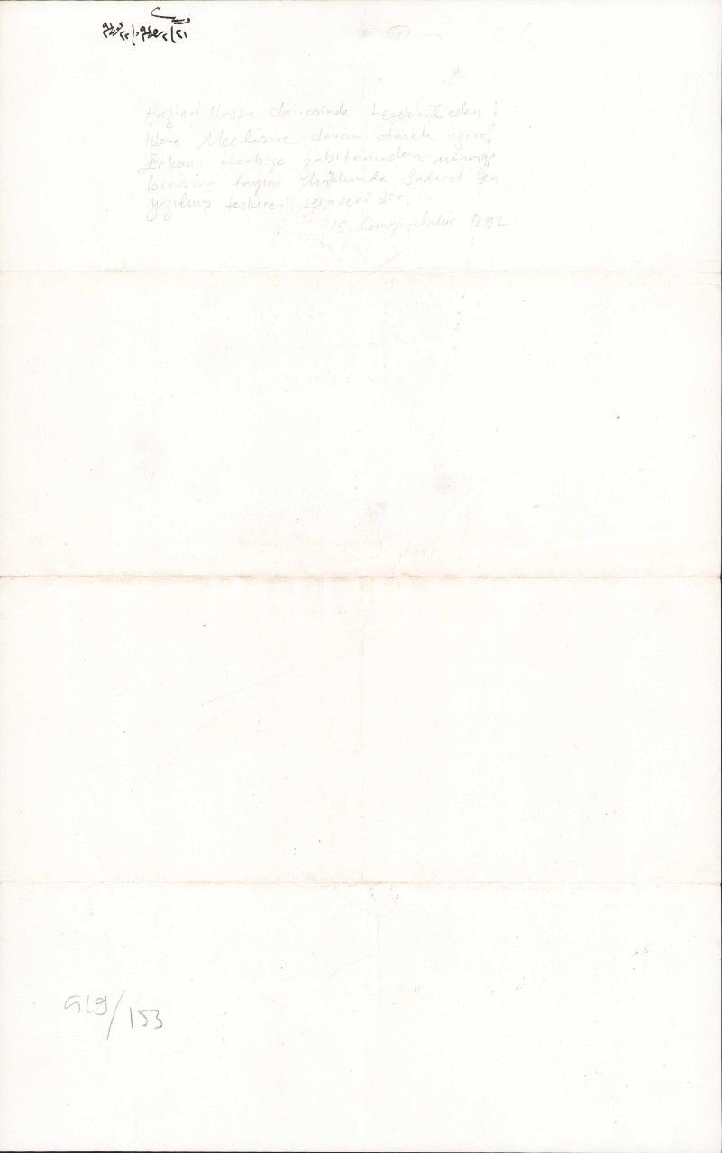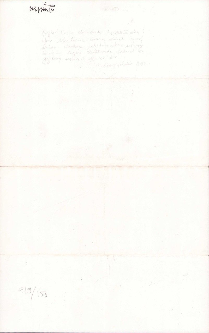 Osmanlıca Hazine-i Hassa Dairesinde teşekkül eden idare meclisine devam etmek üzere Erkan-ı Harbiye zabıtanından münasip birisinin tayini hakkında Sadaretten yazılmış tezkiredir. 1292 tarihli, Osmanlıca, 23x34 cm