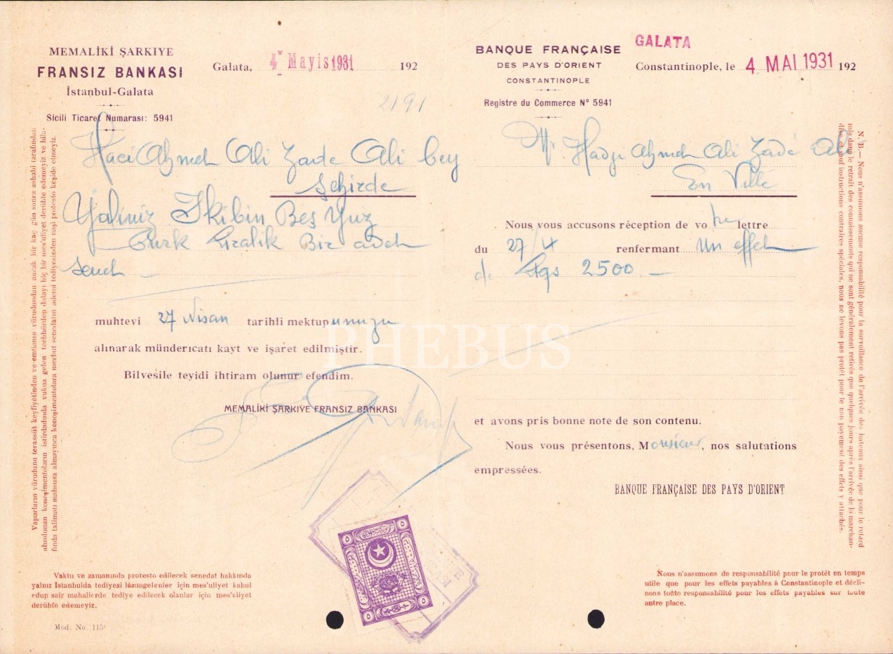 Türkçe Fransızca Memaliki Şarkiye Fransız Bankası İstanbul antetli fatura, 1931, 27x19 cm