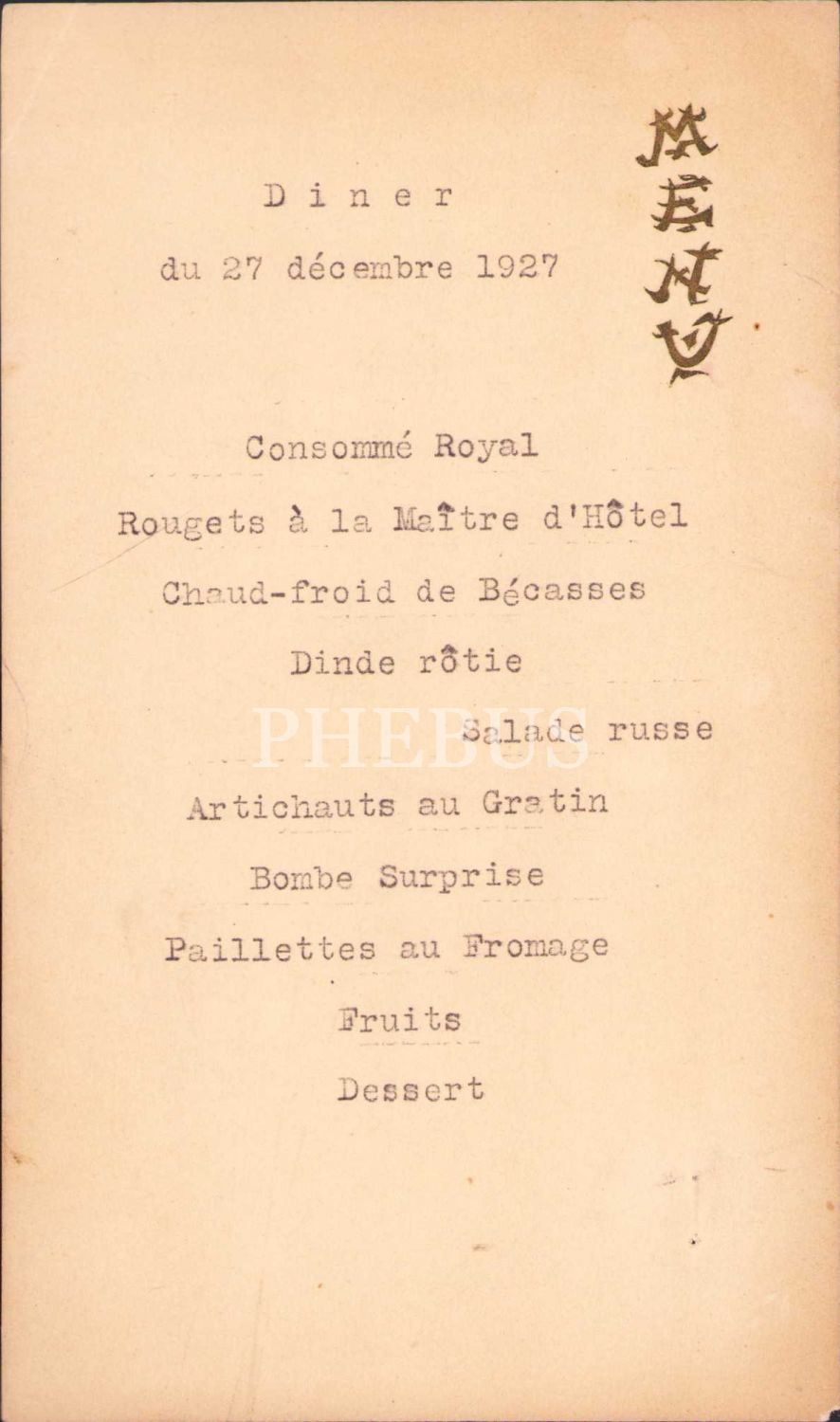 Fransıza 27 Aralık 1927 tarihli akşam yemeği menüsü, 9x15 cm