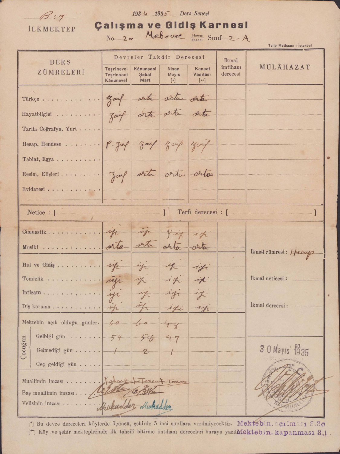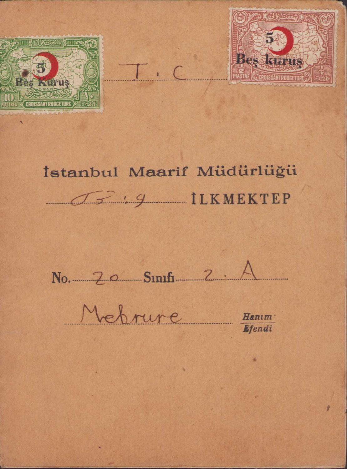 İstanbul Maarif Müdürlüğü Beyoğlu 9. İlk mektep karnesi, 1935 tarihli, Kızılay pullu, mühürlü, Talip Matbaası İstanbul adresli, 11x15cm