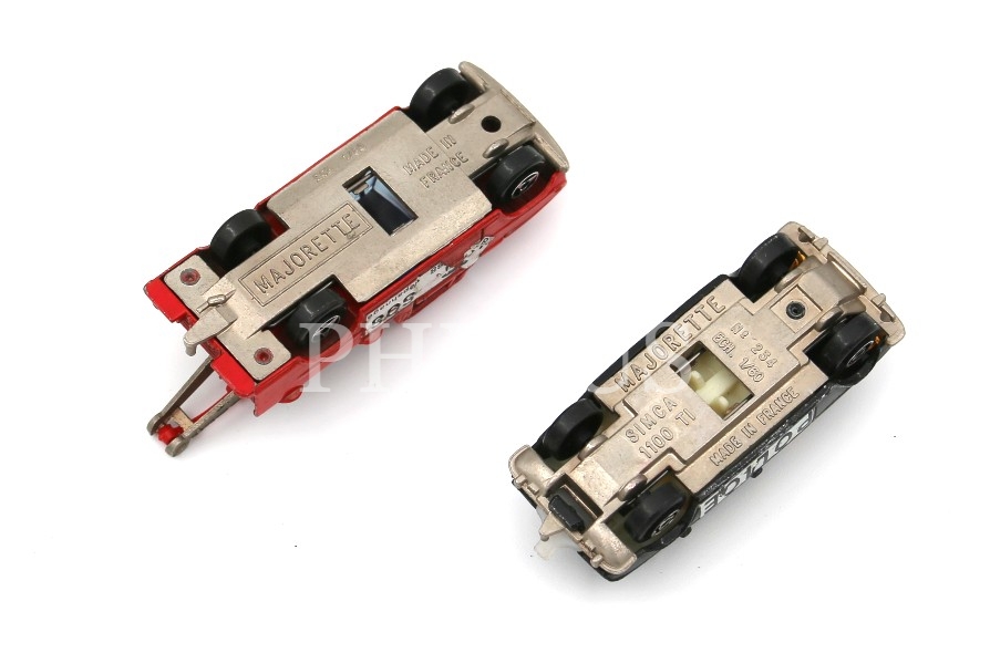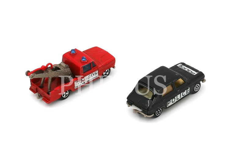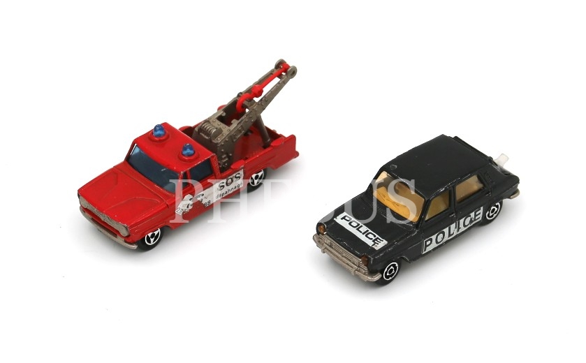 İki adet Majorette araba, Made in France, biri Simca 1100 T1, polis arabası: 7x2 cm, yol yardım arabası: 6x2 cm