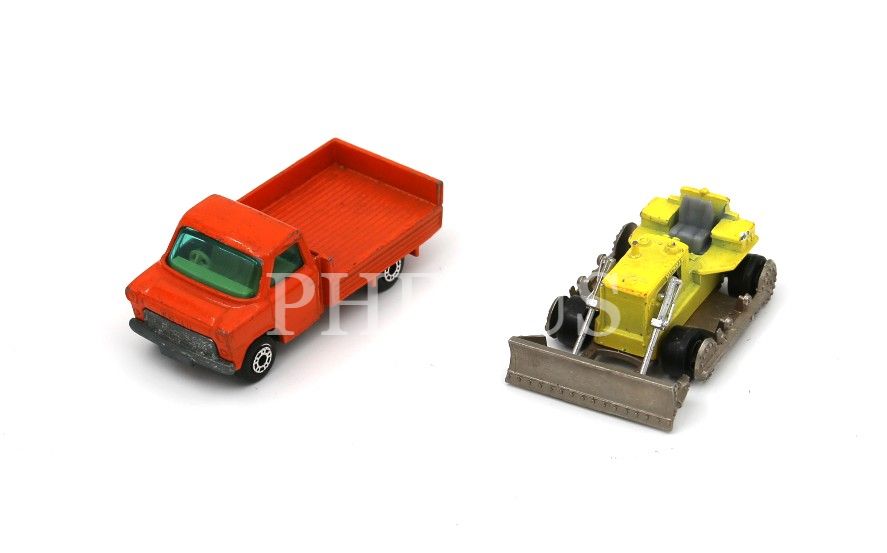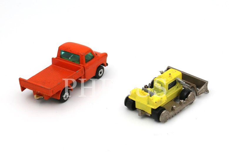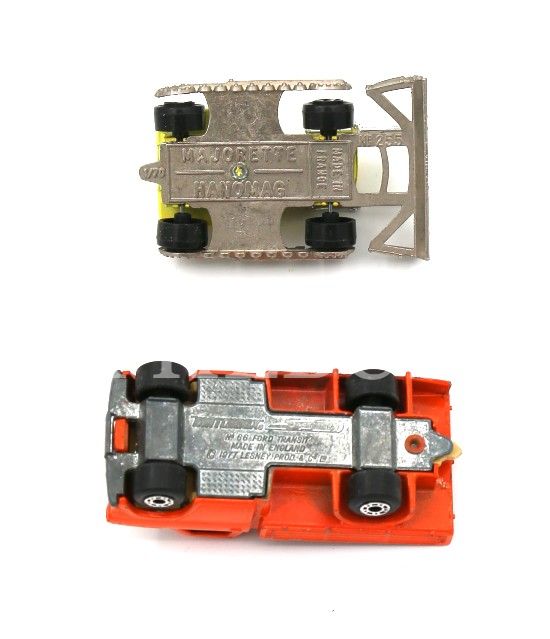 Matchbox 1977 Ford Transit (7x2 cm) ve Majorette Hanomag (6x2 cm)