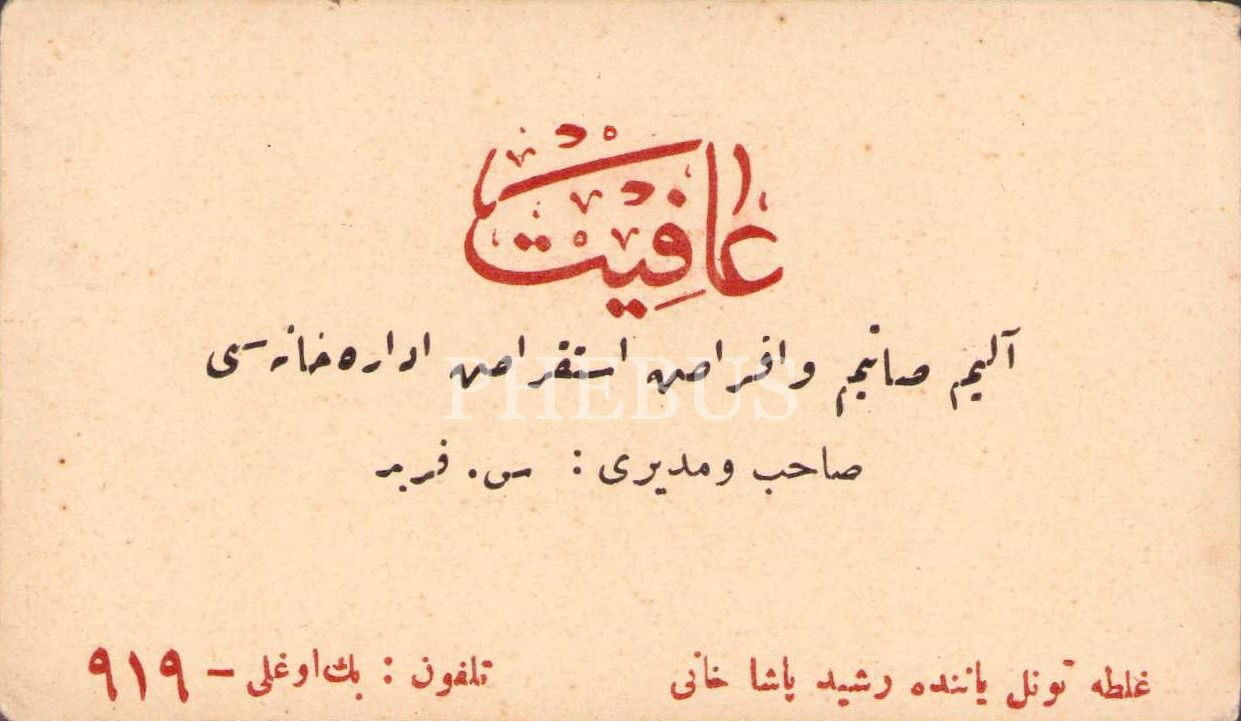 Osmanlıca kartvizit, Afiyet Mağazası - Galata, 10x6 cm