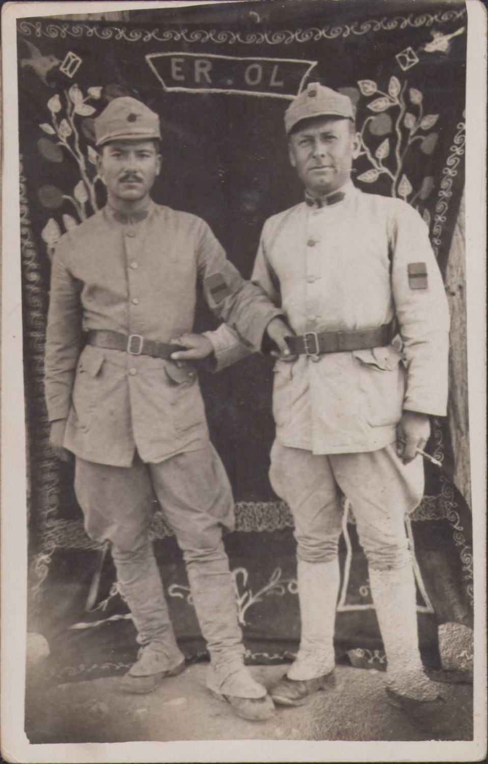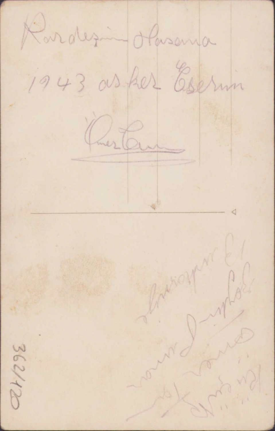 Askerlik fotoğrafı, bez afiş önünde, Burhaniye adresli, 1943 tarihli, 9x14cm