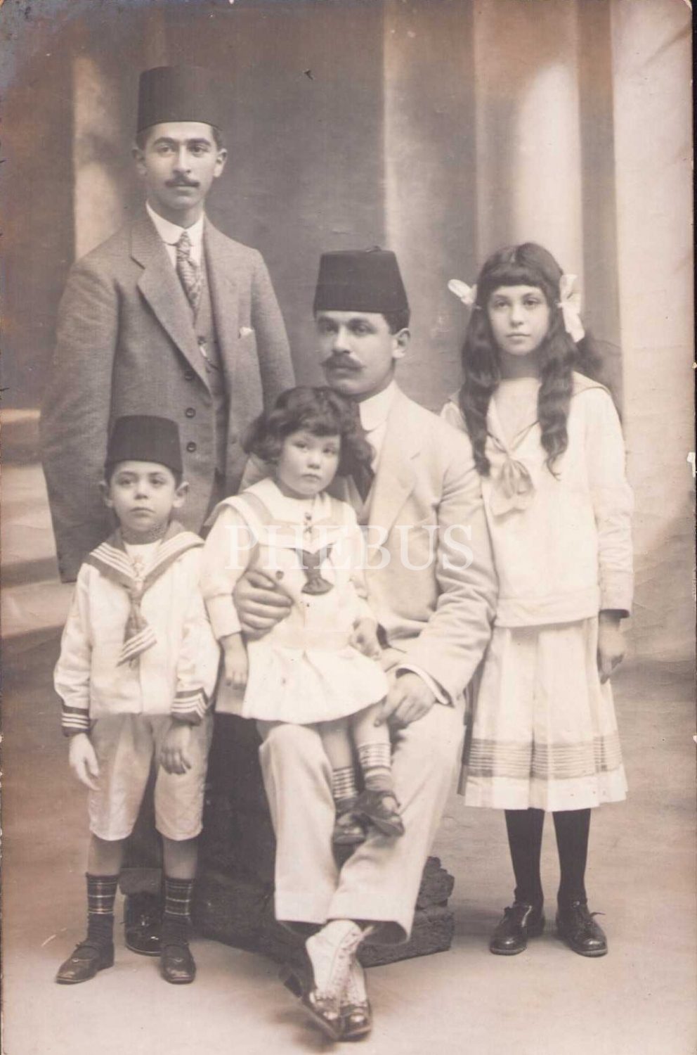 Osmanlı dönemi fesli beyler ve bahriyeli kıyafetli çocuklar stüdyo fotoğrafı, bir kenar haliyle