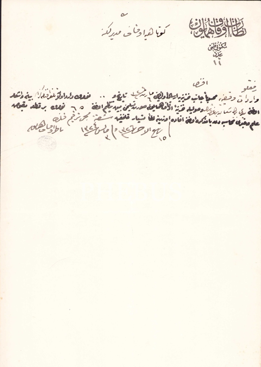 Nezareti Evkaf-ı Hümayun Mektubi Kalemi antetli Kütahya Evkaf Müdürlüğüne yazılmış vakıflar geliri olan makbuz dilekçesinin teslimi alındığını bildiren 1326 tarihli Osmanlıca doküman, 19x27 cm