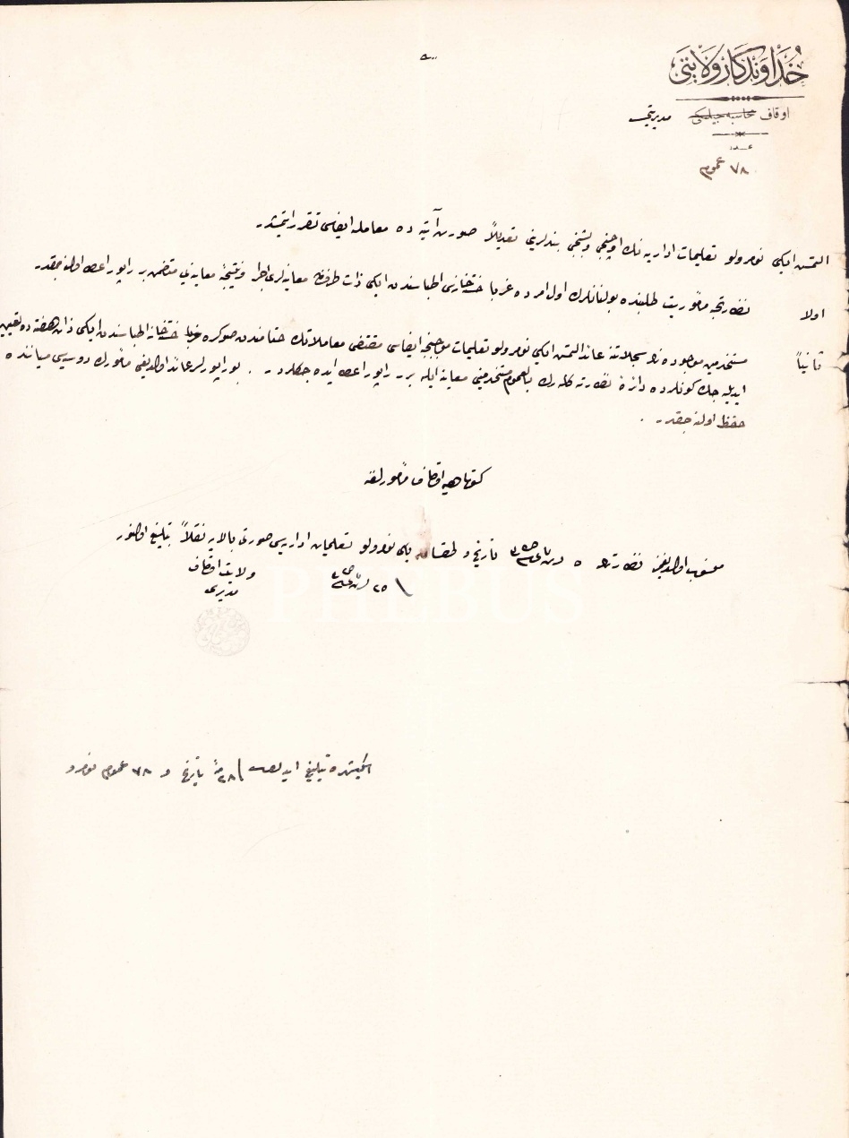 Hüdavendigar [Bursa] Vilayeti antetli Kütahya Evkaf Müdüriyetine yazılmış 1325 tarihli, Mehmet Cemali b. Mahmut mühürlü, Osmanlıca evrak, 23x31 cm