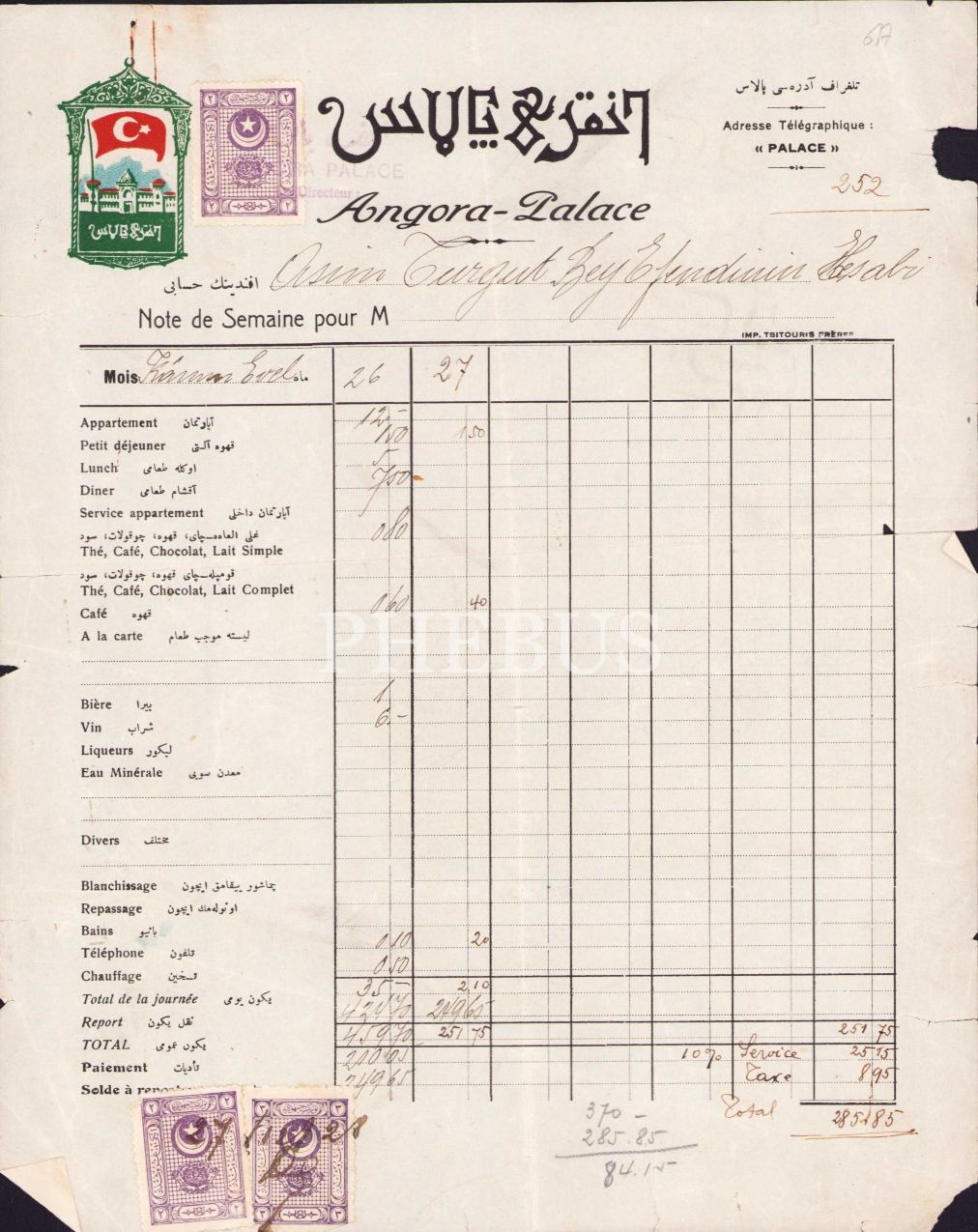 Osmanlıca - Fransızca Angora Palas antetli fatura, 1928 tarihli, 23x27 cm