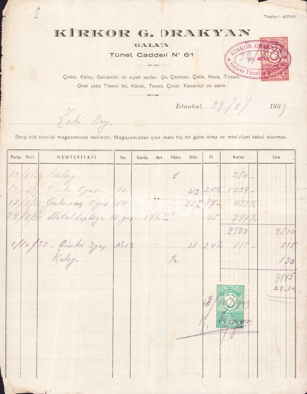 Kirkor G. Orakyan - Galata antetli 1933 tarihli, postadan geçmiş fatura, 20x28 cm