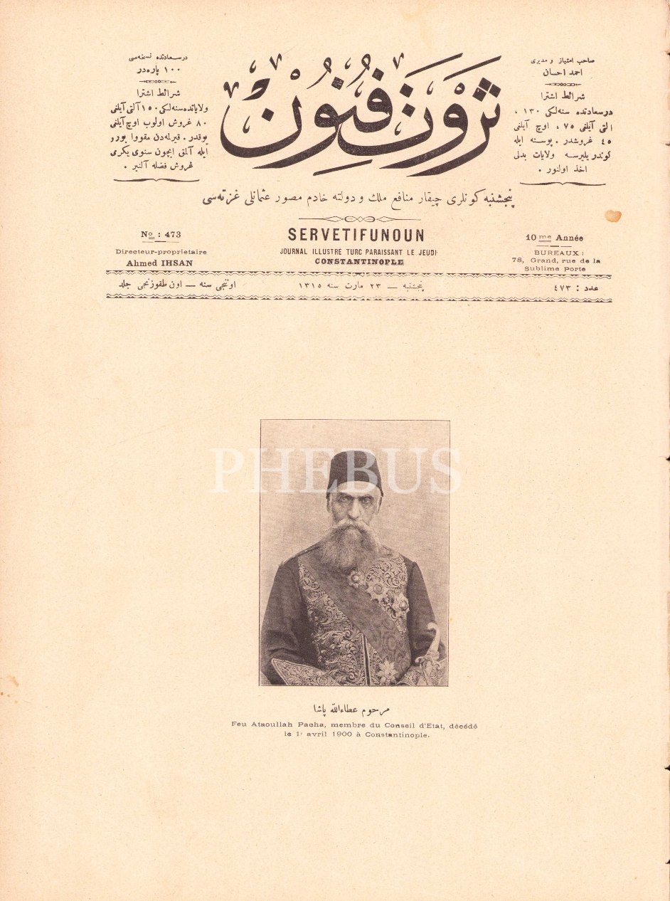 Osmanlıca Serveti Fünun gazetesi, sahibi Ahmed İhsan, 23 Mart 1315, Constantinople, kapak " Merhum Ataullah Paşa", 16 sayfa, 23x32 cm