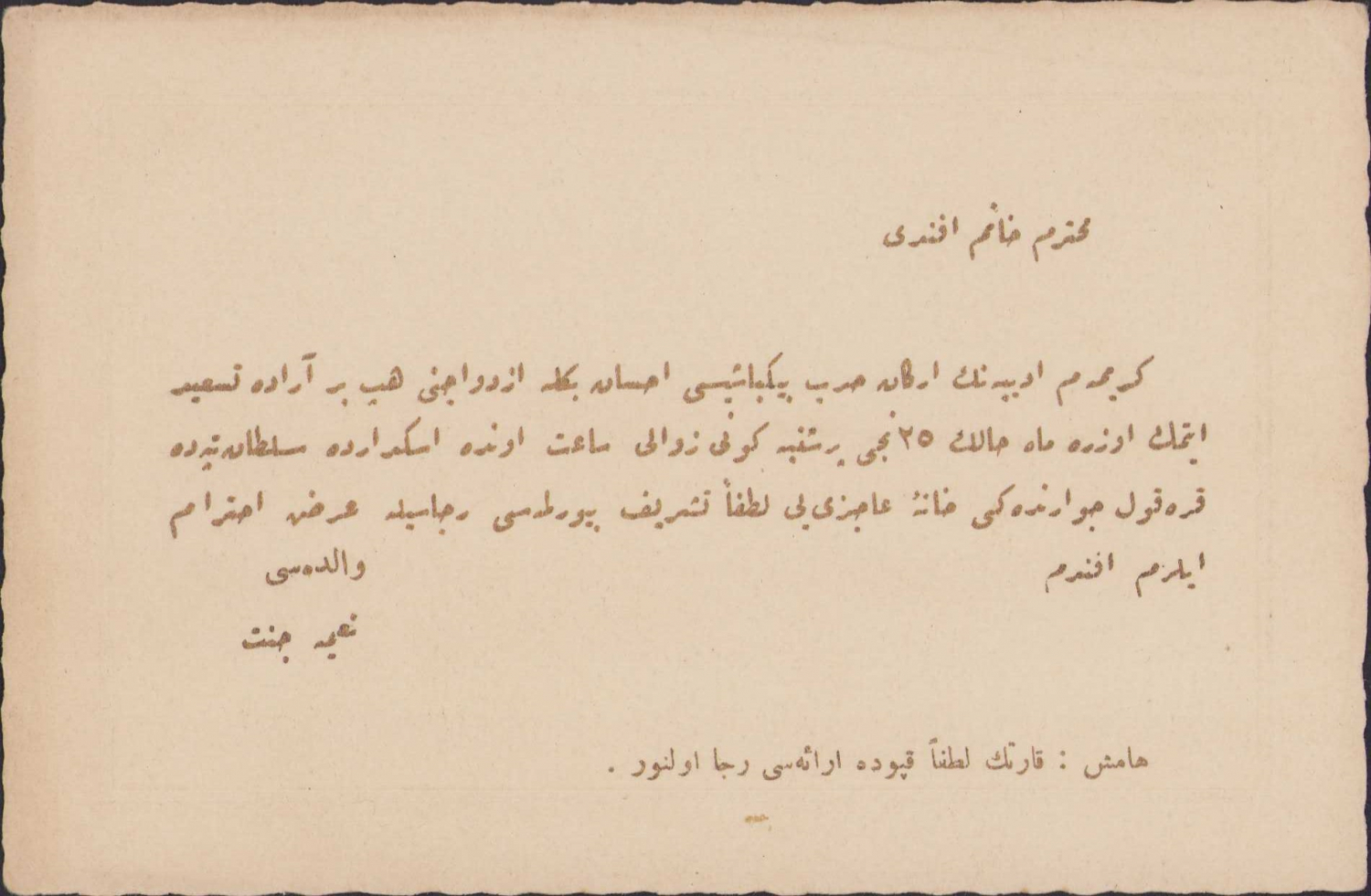 Osmanlı yüzbaşı evlilik merasimi davetiyesi, Üsküdar Adresli, 16x11cm