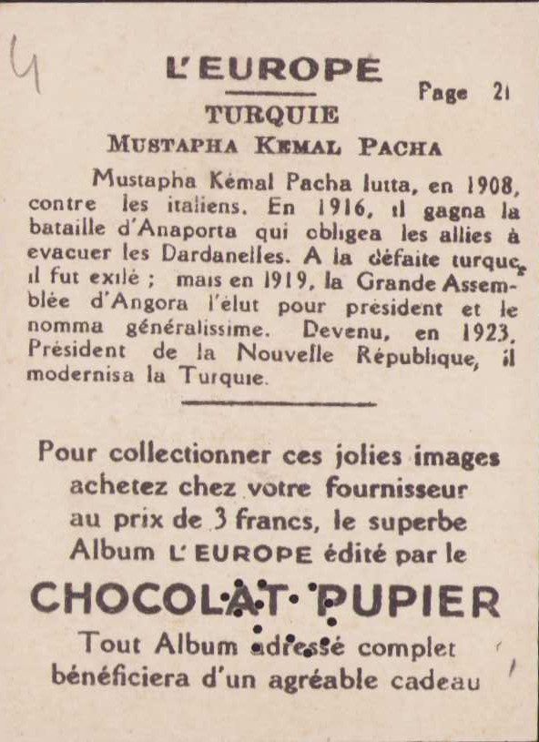 Atatürk portreli çikolata kartı, Fransa baskısı, 5x7cm