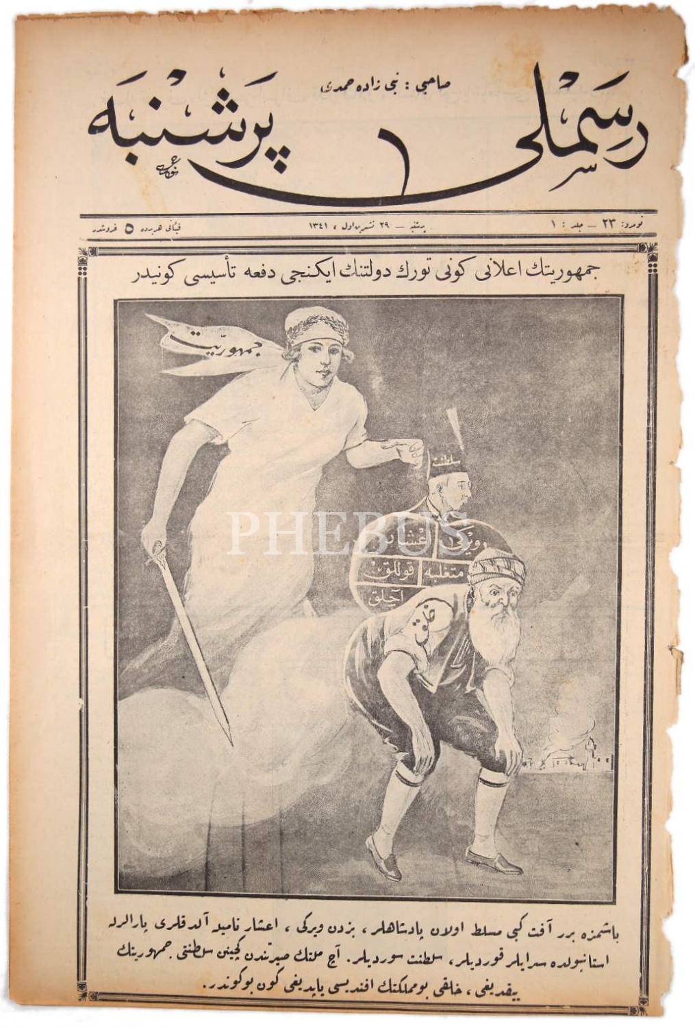 Osmanlıca Resimli Gazete, Cumhuriyetin İlanı, "Cumhuriyetin İlanı Günü Türk Devletinin İkinci Def'a Te'sisi Günüdür", 29 Teşrinievvel 1341, Numro:23, Cild:1, 8 sayfa, cildden çıkma, 27x38 cm