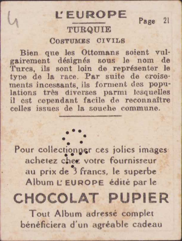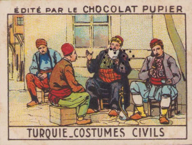 Osmanlı sivil halk kıyafetleri görselli, çikolata kartı, Fransa baskısı, 5x7cm