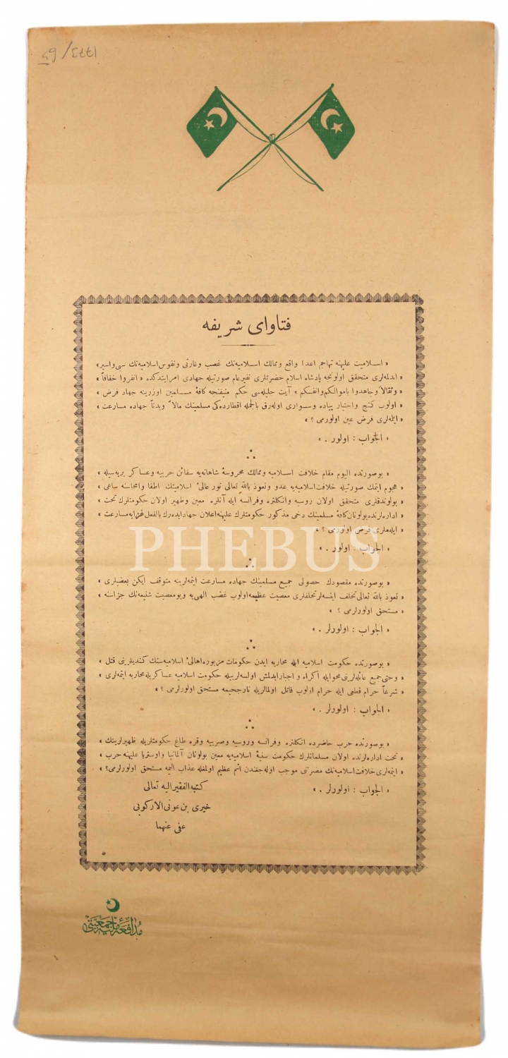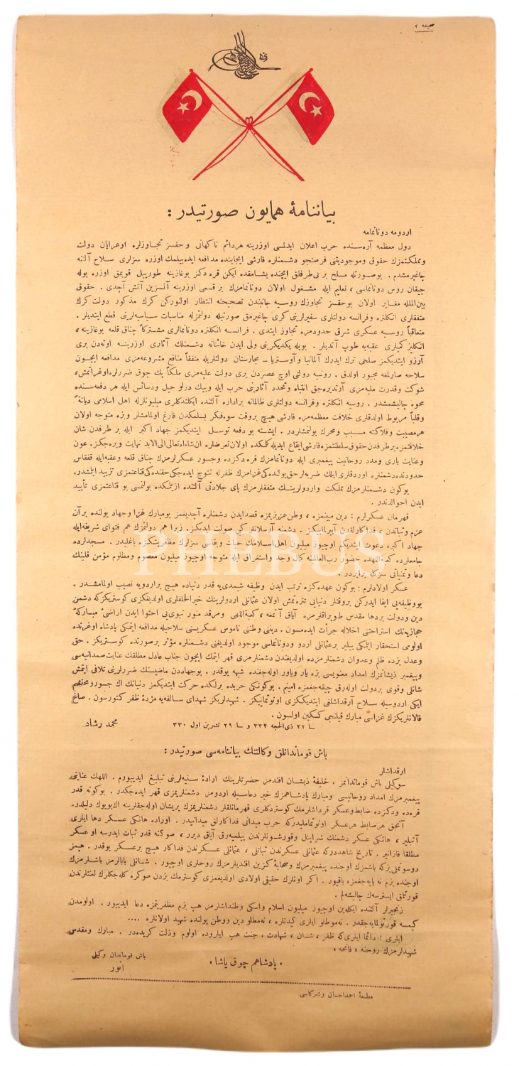 Müdafa-i Milliye Cemiyeti arması damgalı Osmanlı Devleti'nin Birinci Dünya Savaş İlanı: Fetvayı Şerif [Cihat Fetvası], arkası Beyanname-i Hümayun sureti, Ahmed İhsan ve Şürekası Matbaası, 22x50 cm